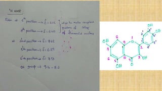 The document discusses the structural elucidation of quercetin, detailing its sources, molecular structure, and characteristics. It highlights the results of various spectral analyses that confirm the presence of hydroxyl, carbonyl, and aromatic groups, and elaborates on the synthesis methods of quercetin. The conclusion asserts that quercetin's structure is validated through comprehensive spectral data.