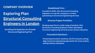 Plan Structural Consulting Engineers is a leading structural engineering firm in London, established in 2005, offering innovative solutions across various industries. Their core services include project management, structural design, building surveys, and feasibility studies, highlighted by notable projects like The Shard and the Battersea Power Station redevelopment. Structural engineers are crucial for ensuring safety and stability, designing resilient structures, evaluating integrity, and collaborating with architects.