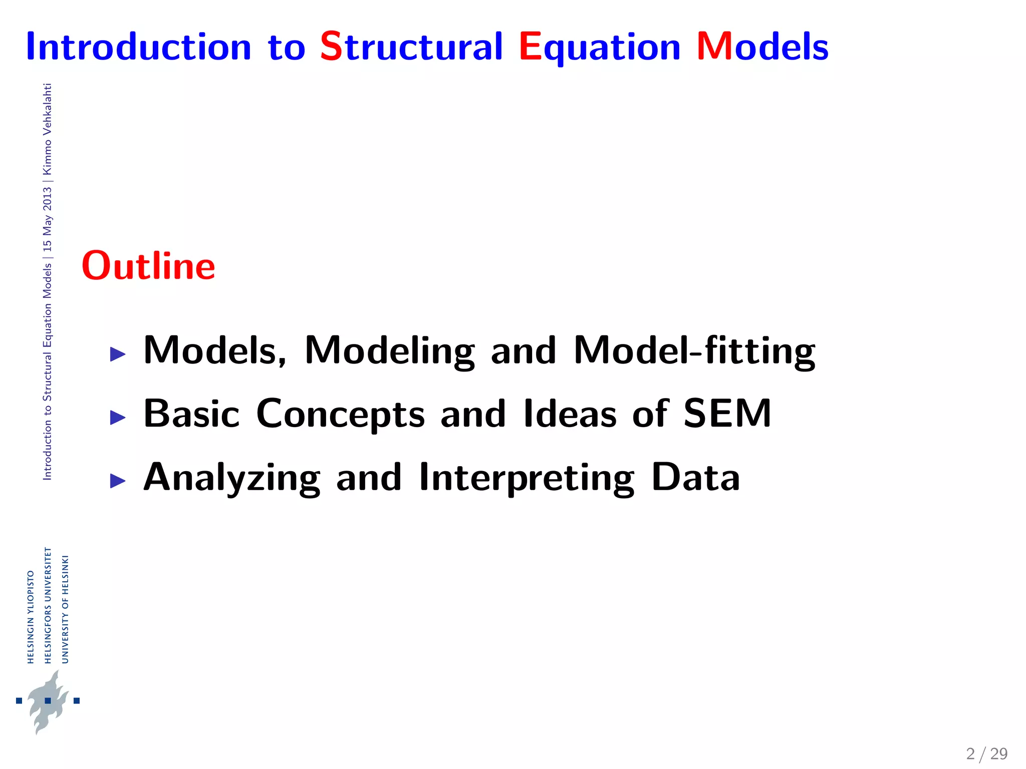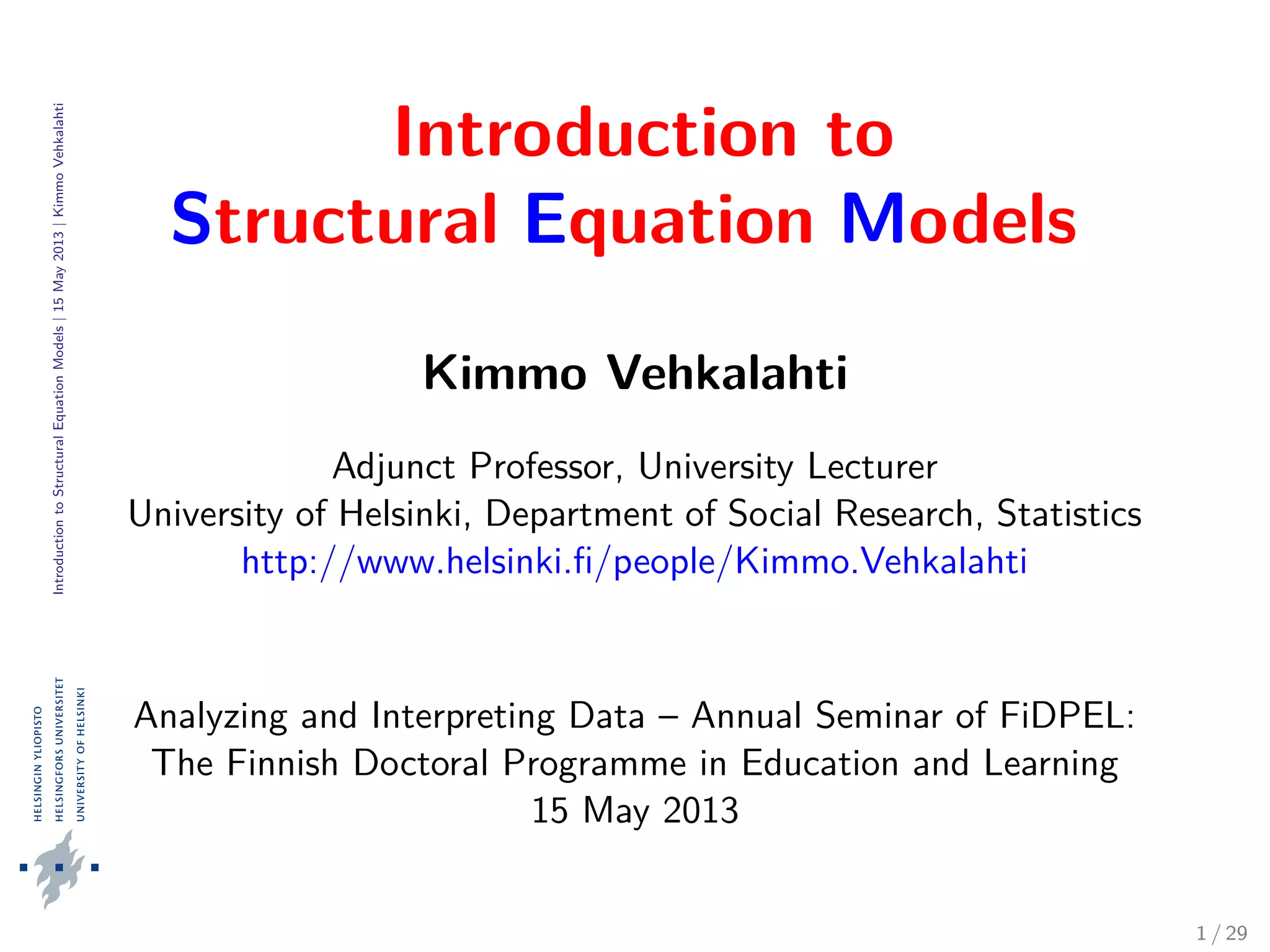 The document provides an introduction to structural equation modeling (SEM). It discusses key concepts such as latent and observed variables, and measurement models. It also presents examples of confirmatory factor analysis output to illustrate model fitting and interpretation. Specifically, it analyzes a four-factor CFA model with academic self-concept variables and reports various goodness-of-fit statistics and parameter estimates to assess how well the hypothesized model fits the sample data.