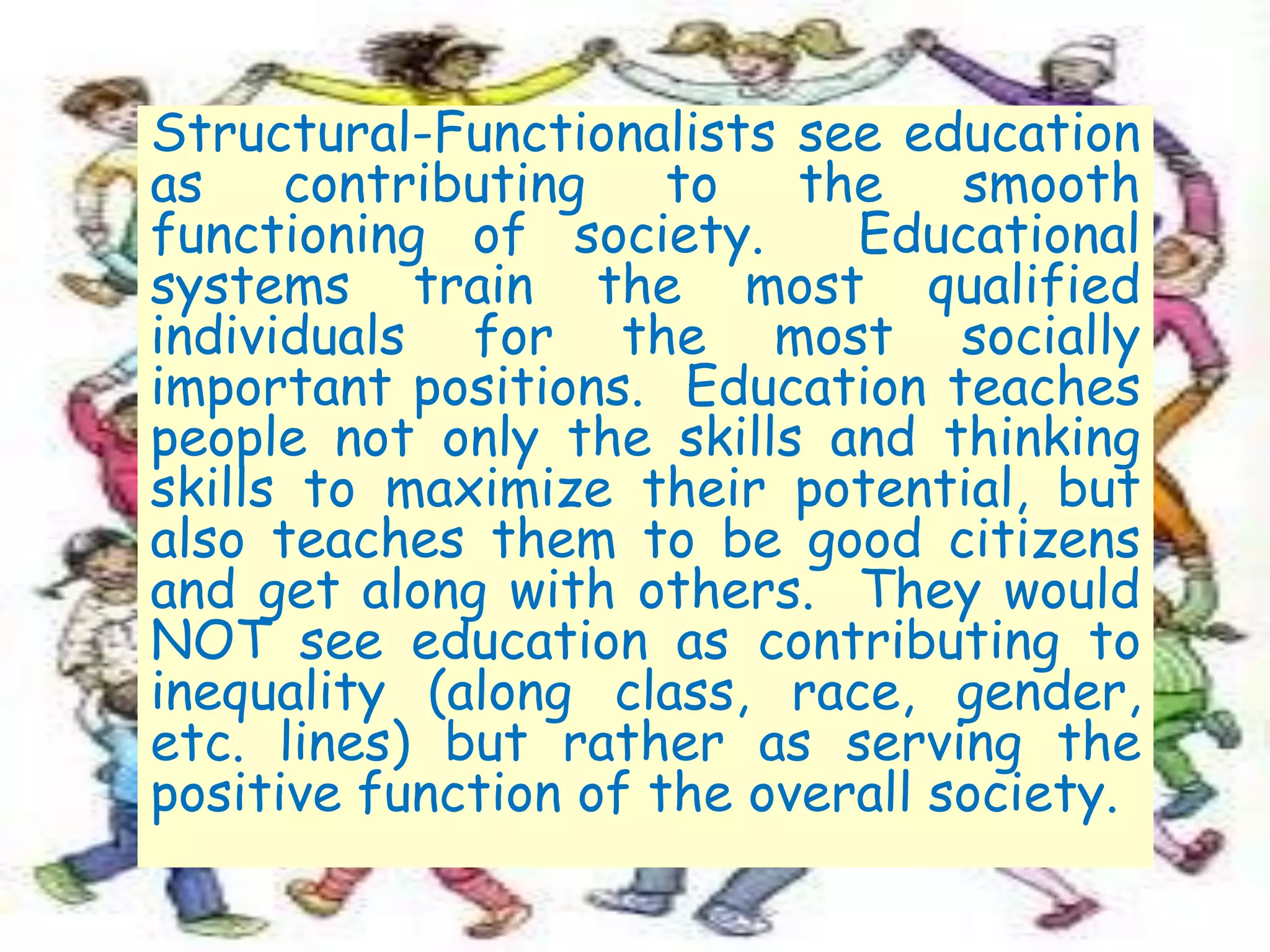 Structural-functionalists see the key functions of education as contributing to the smooth functioning of society. The education system trains individuals for important social roles, teaches skills to maximize potential, and instills norms of good citizenship and cooperation. Structural-functionalists do not view education as perpetuating inequality but rather as serving the overall positive function of society.