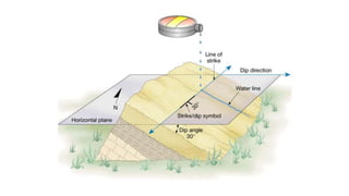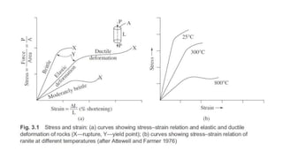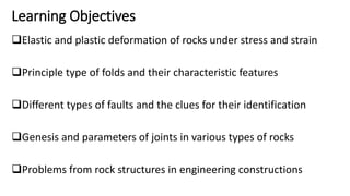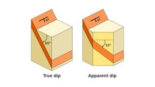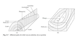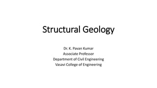 This document provides an overview of structural geology taught by Dr. K. Pavan Kumar. It defines key terms like folds, faults, joints and discusses the mechanisms of rock deformation under stress, including brittle and ductile behavior. Folds form due to horizontal forces bending stratified rocks. The main types are anticlines and synclines, which are identified by the relative ages of beds. Other topics covered include strike, dip, apparent vs true dip, and how to measure dimensions of outcrops, beds and depth.