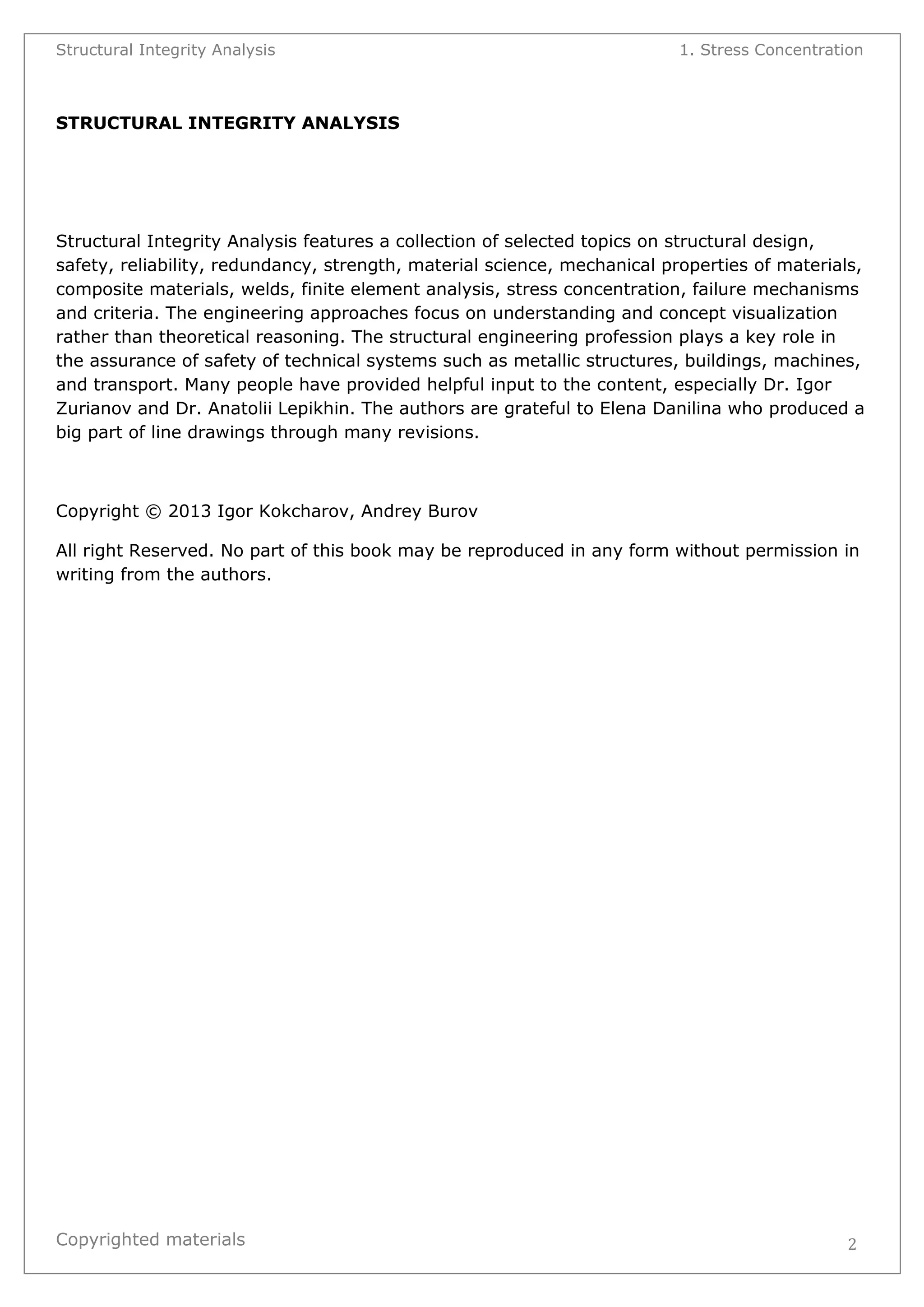 The document discusses structural integrity analysis with a focus on stress concentration, covering key concepts such as stress, strain, and stress concentrators in various engineering contexts. It highlights the importance of understanding these factors for the safety and reliability of structures, including issues related to plasticity and failure mechanisms. Practical design recommendations are offered to mitigate stress concentrations and improve structural performance.