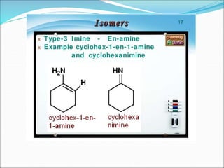This document discusses different types of isomerism including structural isomerism and stereoisomerism. Structural isomerism occurs when compounds have the same molecular formula but different structural formulas. Types of structural isomerism include chain isomerism, positional isomerism, and functional group isomerism. Chain isomerism involves compounds having the same molecular formula but different carbon chain structures. Positional isomerism involves compounds having functional groups at different positions. Functional group isomerism involves compounds having different functional groups. Stereoisomerism occurs when compounds have the same connectivity of atoms but different arrangements in space.