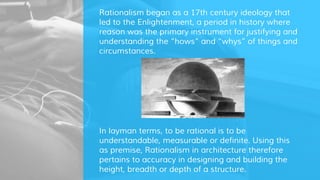 The document discusses structural rationalism in architecture from the 17th century to the 20th century. It began as an ideology focused on using reason and accurate measurements to design structures. In the 18th century, rationalism emphasized symmetrical geometric forms and neoclassical designs. Important rationalist architects like Viollet-le-Duc rejected ornamentation in favor of highlighting the functional structure. Examples given include the Lycee Voltaire school building and Palazzo Gualino office building, both employing modular designs, industrial materials, and functional floor plans.