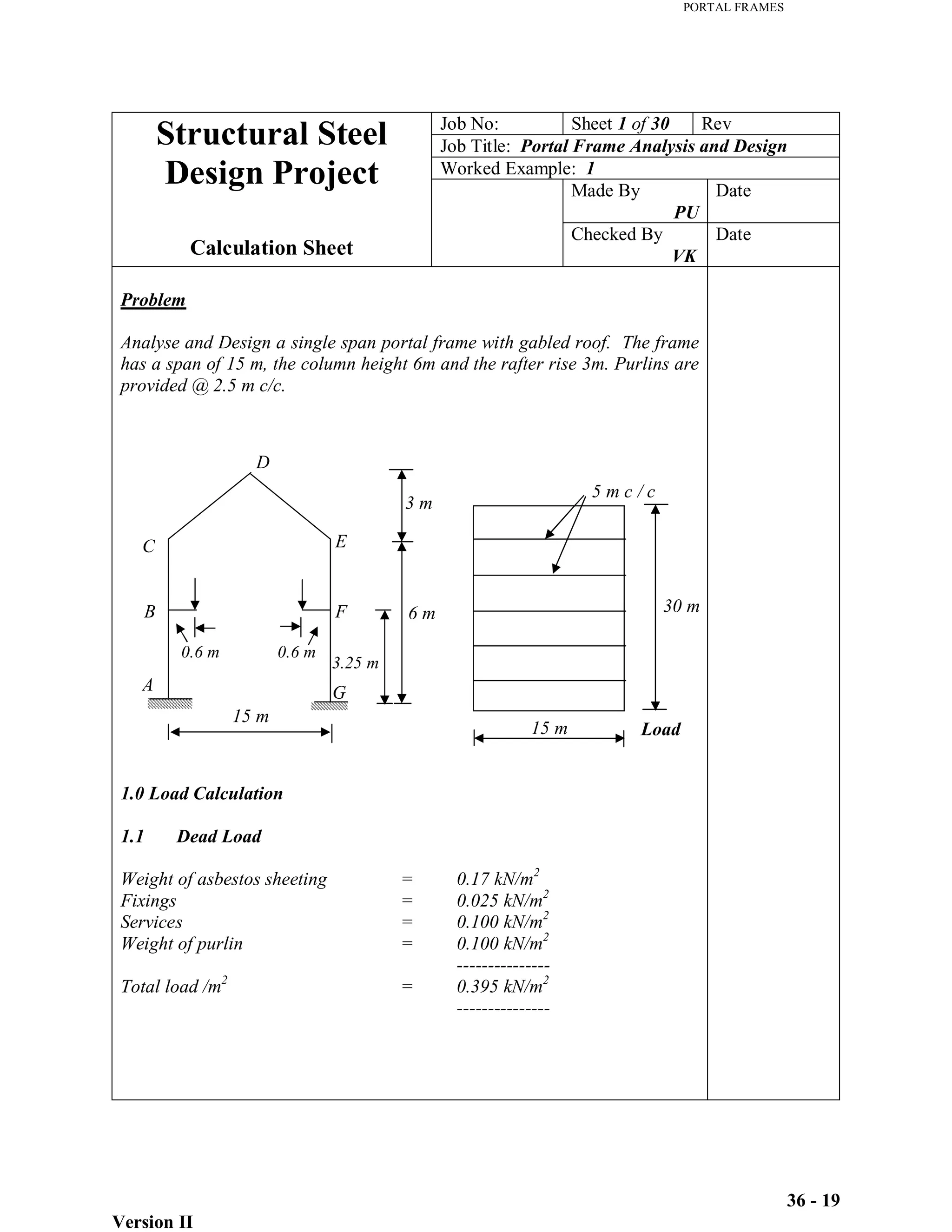 This document provides load calculations and structural analysis for a single span portal frame with a span of 15 m. It includes: