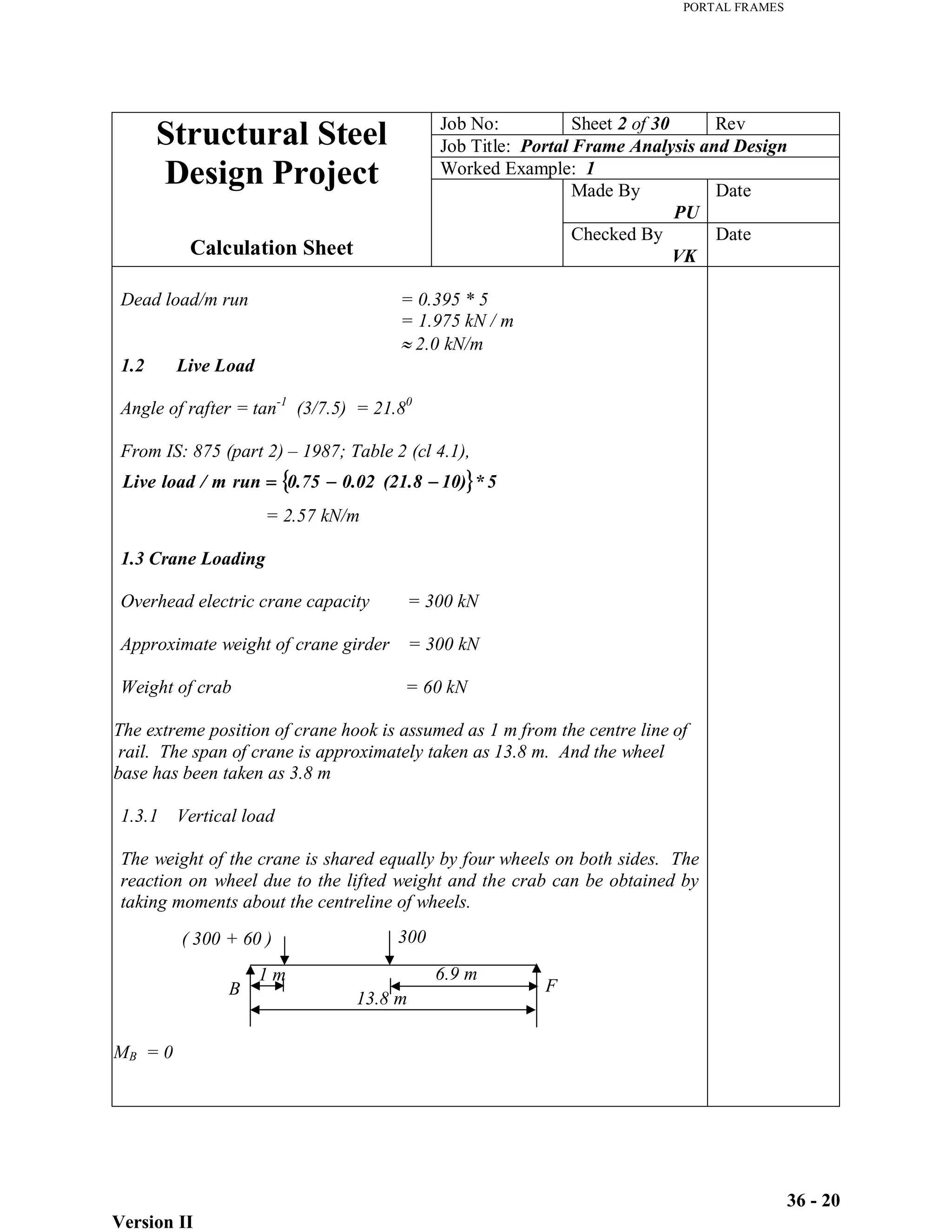 1) Calculation of dead loads, live loads, and crane loading on the frame.