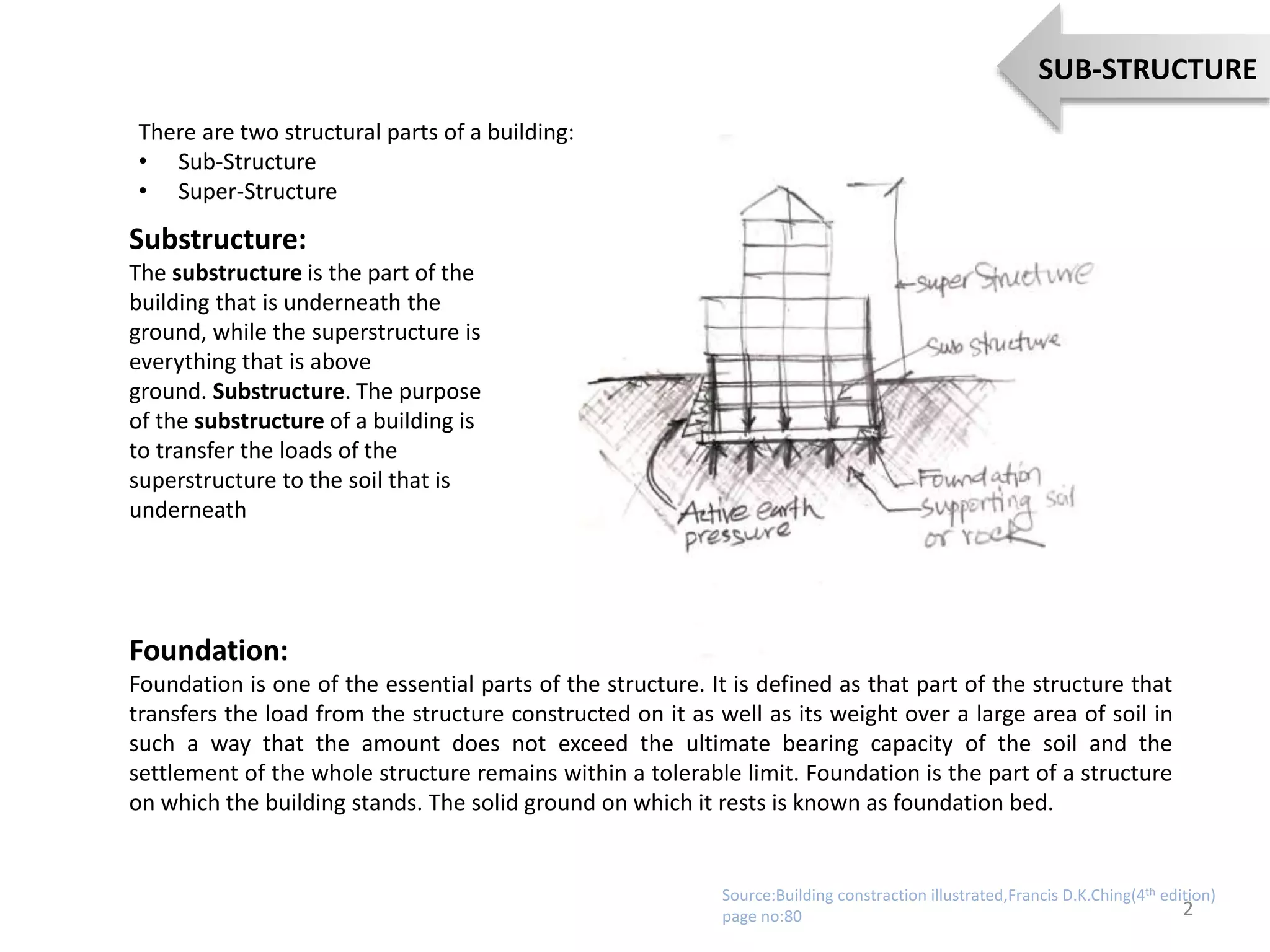 The document summarizes the structural system of buildings, focusing on foundations and substructures. It defines foundations as the part of the structure that transfers loads from the building to the soil. Substructures are the parts of buildings located underground, transferring loads from the superstructure above ground to the soil. There are different types of shallow foundations, including spread footings, wall footings, combined footings, and raft/mat foundations, as well as deep pile foundations, classified based on function, materials, and installation methods. Foundations are designed according to soil conditions and building loads to distribute weight effectively while preventing settlement.