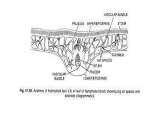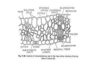The document summarizes structural variations in the leaves of three plant species: Typha, Nymphea, and maize. For Typha leaves, it notes that the epidermis is thin to absorb nutrients from water, sclerenchyma tissues are reduced as water provides support, and air chambers are present. Nymphea leaf modifications include a flattened petiole called a phyllode with sunken stomata and vascular bundles in a ring. Maize leaves have an undifferentiated mesophyll and collateral, closed vascular bundles with larger bundles supported by sclerenchyma.
