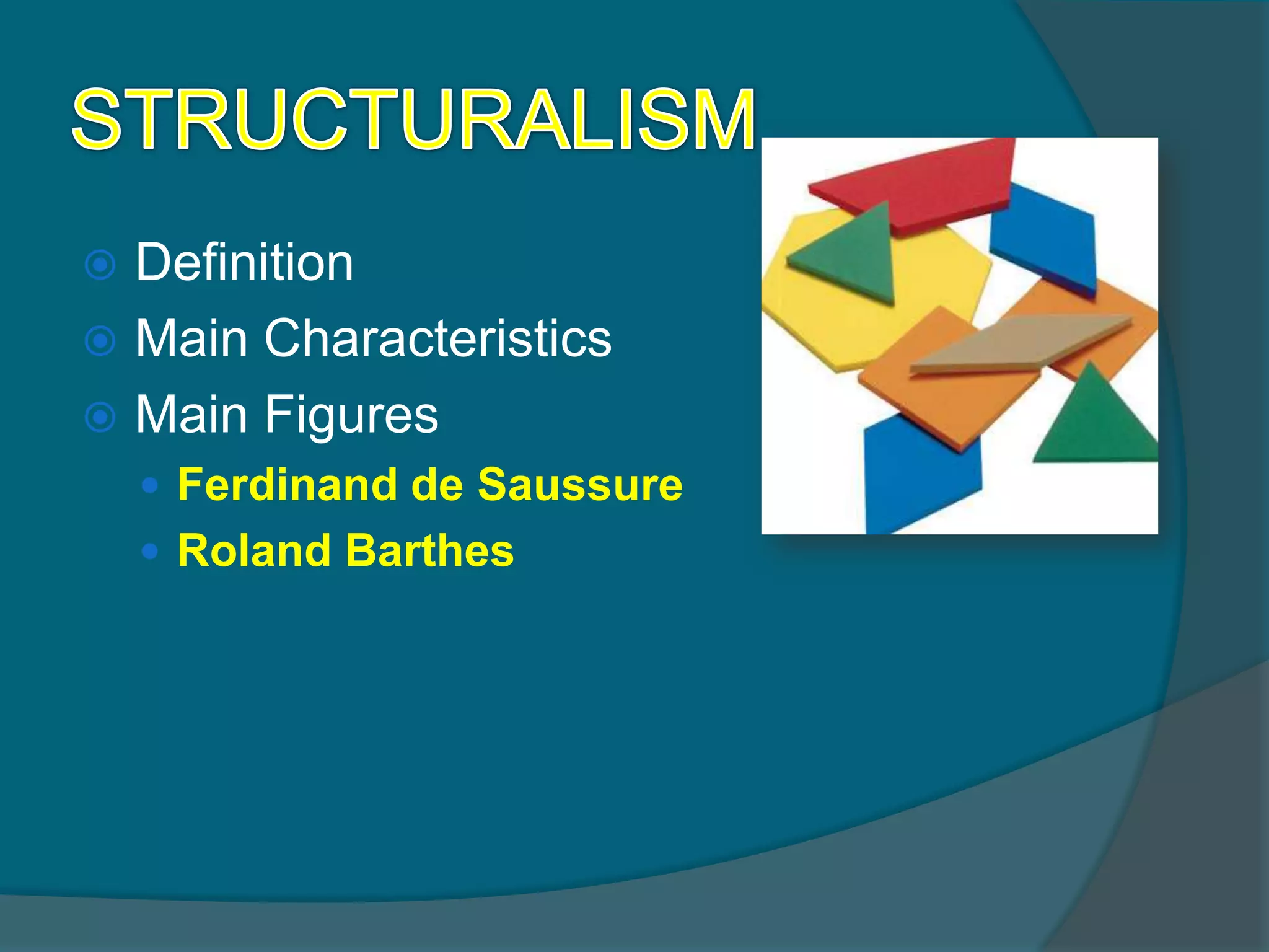 Structuralism seeks to identify the underlying systems and conventions of literature. Key figures include Ferdinand de Saussure and Roland Barthes. Saussure viewed language as a social institution and structure that could be studied synchronically. He introduced concepts like the sign, signifier, and signified. Barthes extended structural analysis and semiotics to broader cultural phenomena, helping transition structuralism to post-structuralism.