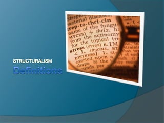 Structuralism seeks to identify the underlying systems and conventions of literature. Key figures include Ferdinand de Saussure and Roland Barthes. Saussure viewed language as a social institution and structure that could be studied synchronically. He introduced concepts like the sign, signifier, and signified. Barthes extended structural analysis and semiotics to broader cultural phenomena, helping transition structuralism to post-structuralism.