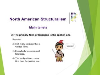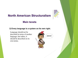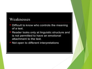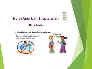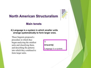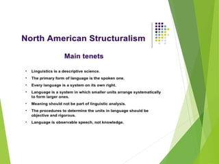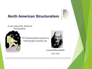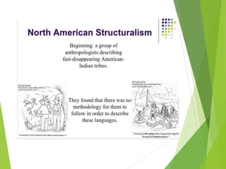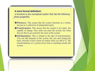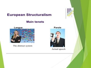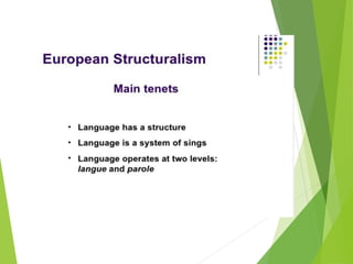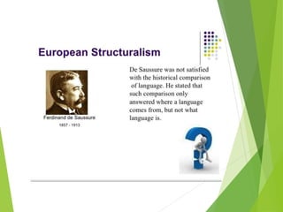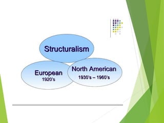 Structuralism emerged in France in the 1950s through the work of Claude Levi-Strauss and Roland Barthes. It believes that phenomena can only be understood in the context of larger structures. Structuralism analyzes relationships between signs and seeks to locate systems of meaning within cultural structures. It was applied to fields like anthropology, sociology, and literature. Key thinkers were Levi-Strauss, who applied structural linguistics concepts to anthropology, and Barthes, who examined aspects of modern culture from a structural perspective.