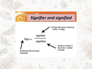 Structuralism, founded by Swiss linguist Ferdinand de Saussure, is a socio-linguistic and intellectual movement that focuses on the structure of language and has implications in various fields. It emphasizes the system of signs, where meanings are derived from relationships between signifiers and signifieds, indicating that language shapes reality rather than merely reflecting it. The document outlines key principles of structuralism, examines its application in literature, and discusses its relevance in understanding cultural artifacts.