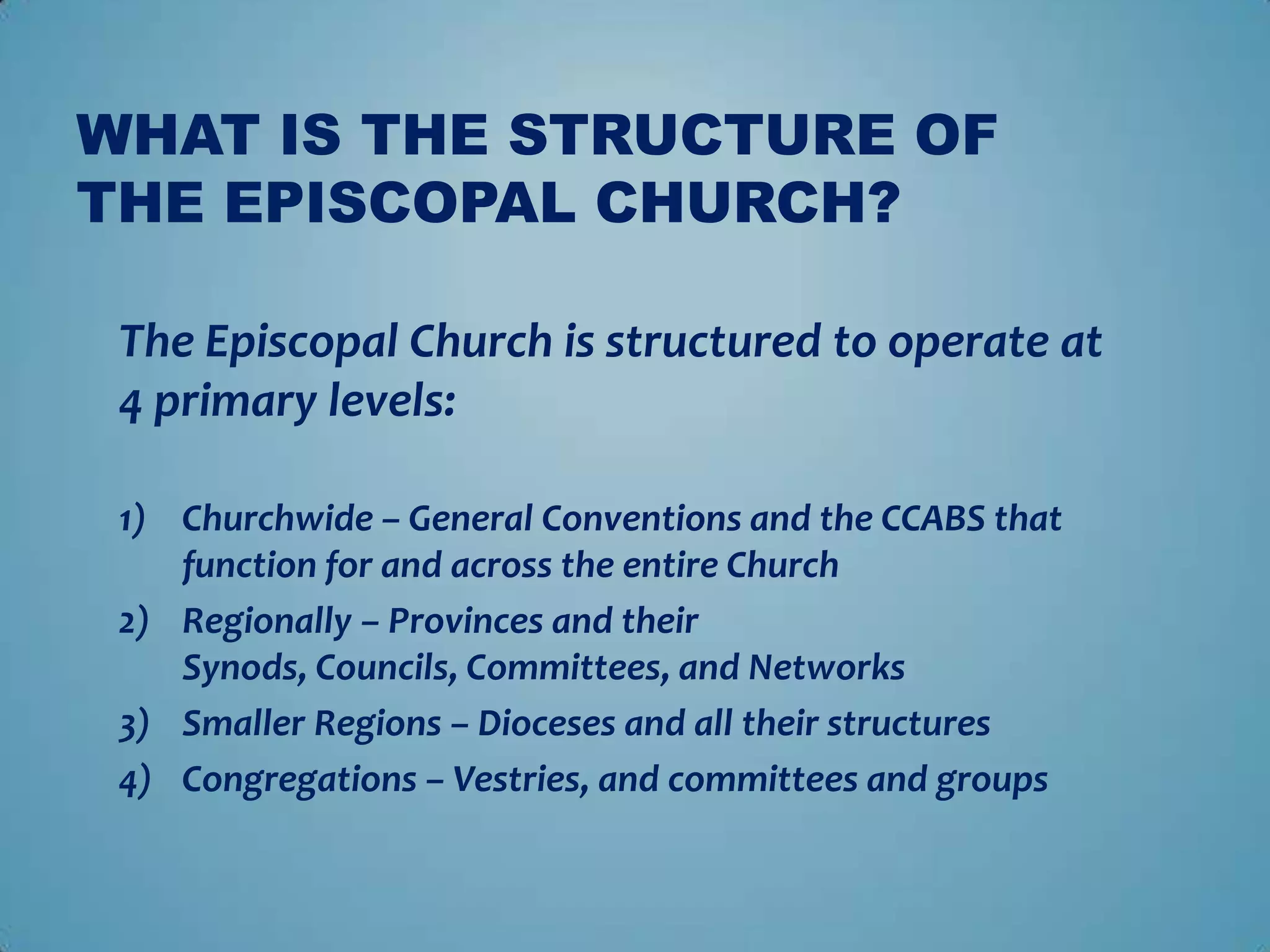 The document outlines the structure of the Episcopal Church, which operates at four levels: churchwide, regional, smaller regional, and congregational. It emphasizes the church's mission to restore unity among people and God through worship, justice, and love, while portraying its governance as complex, democratic, and requiring regular assessment. Additionally, it discusses proposed reforms and strategies for governance aimed at enhancing the church's mission and increasing diversity within its leadership.