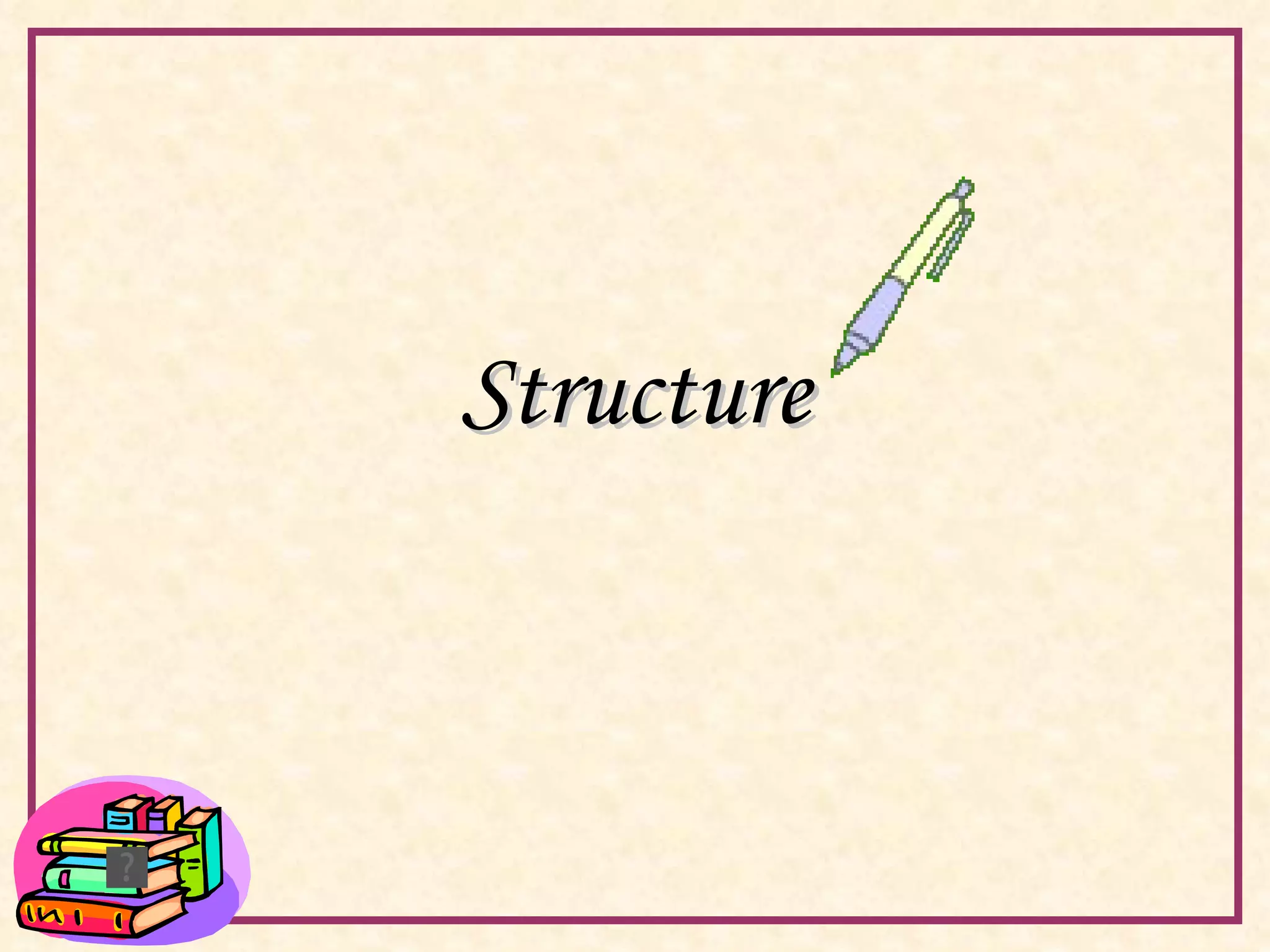 The document discusses the key elements of plot structure and narrative techniques in fiction. It defines plot as the sequence of events in a story and structure as the pattern an author uses to arrange the plot. Common plot structures include exposition, initial conflict, main conflict, complications, climax, and resolution. Literary fiction may employ more complex structures like flashbacks, stream of consciousness, or nonlinear chronology. Conflict is a key driver of structure and can involve man against man, self, nature, supernatural forces, or fate. Characters include protagonists and antagonists. Suspense keeps readers engaged by creating curiosity and anxiety around a likeable character's fate. Endings can be happy or unhappy, with unhappy endings sometimes justifying