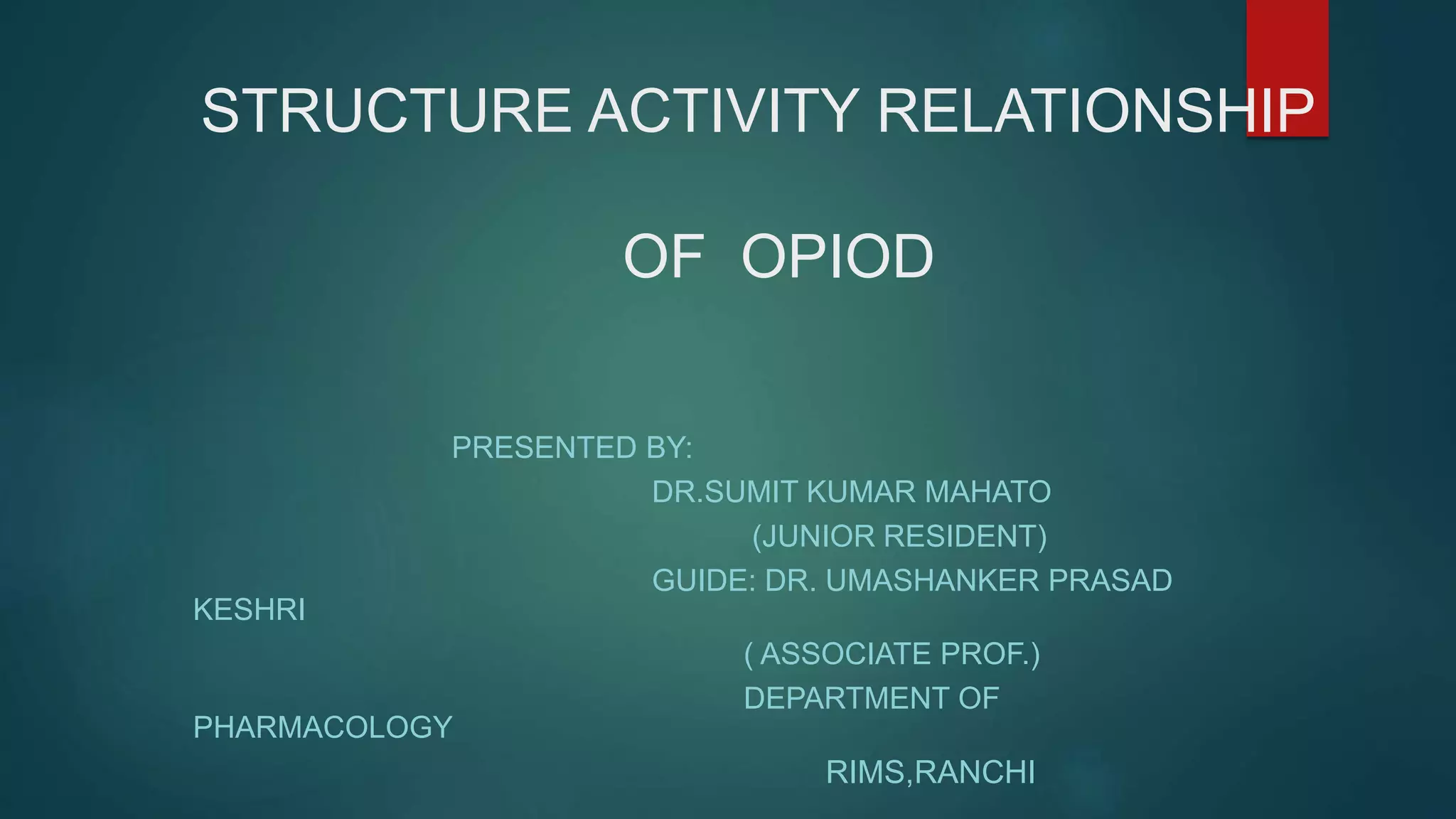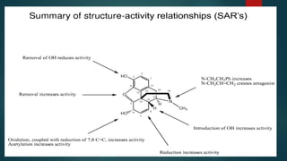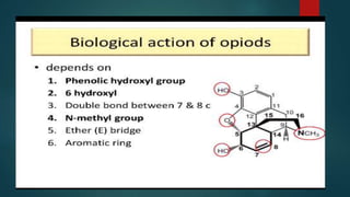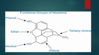 The document discusses the structure-activity relationship (SAR) of opioids. It begins by defining SAR as the relationship between a molecule's chemical structure and its biological activity. Modifications to a drug's structure, including altering functional groups, can change its potency and effects. The structures of morphine, codeine, and heroin are examined as examples. While the methyl group on codeine decreases potency versus morphine, the acetyl groups on heroin allow it to cross the blood-brain barrier more easily and produce a stronger euphoric effect. Understanding SAR enables the design of new opioid drugs with tailored pharmacological properties.