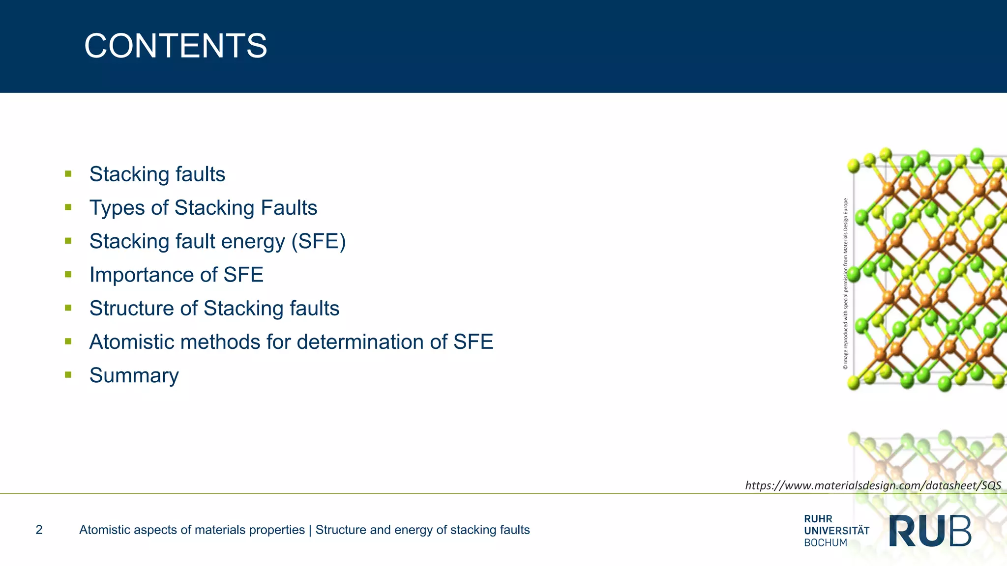 The document discusses stacking faults in materials. It defines stacking faults as deviations from the ideal crystal structure that result in a fault in the periodic stacking sequence. There are different types of stacking faults, such as growth faults and deformation faults, depending on how the fault plane is shifted. The stacking fault energy is an important property that is inversely related to the stacking fault width and affects properties like cross-slip and creep resistance. First-principles calculations can be used to determine stacking fault energies by modeling the structure and calculating the energy of configurations with and without intrinsic stacking faults.