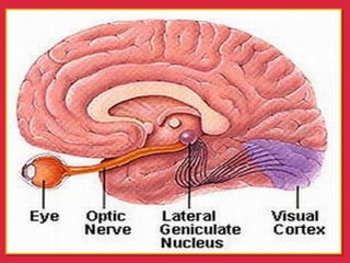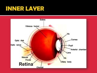 The eye is a spheroid structure around the size of a ping pong ball that functions to distinguish light, dark, shape, color, brightness and distance. It includes structures like the eyelids, conjunctiva, cornea, iris, pupil, lens, vitreous humor, retina, blood vessels and optic nerve. The retina contains light-sensitive photoreceptor cells called rods and cones that convert light into electrical signals to the brain where they are interpreted as vision.