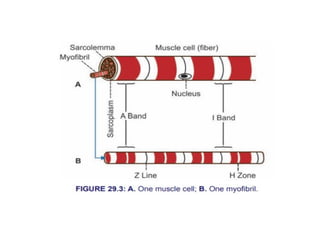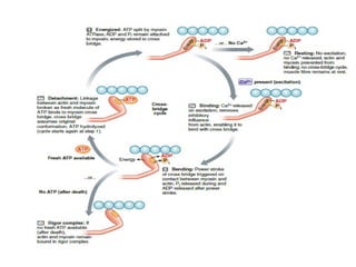 The document outlines the structure and function of muscle proteins myosin and actin, detailing myosin's composition and its role in muscle contraction through the sliding filament mechanism. It explains how actin filaments interact with myosin heads during contraction, regulated by tropomyosin and troponin in response to calcium ions released from the sarcoplasmic reticulum. This interaction is essential for muscle fibers to contract properly, with the document also referencing sources for further reading.