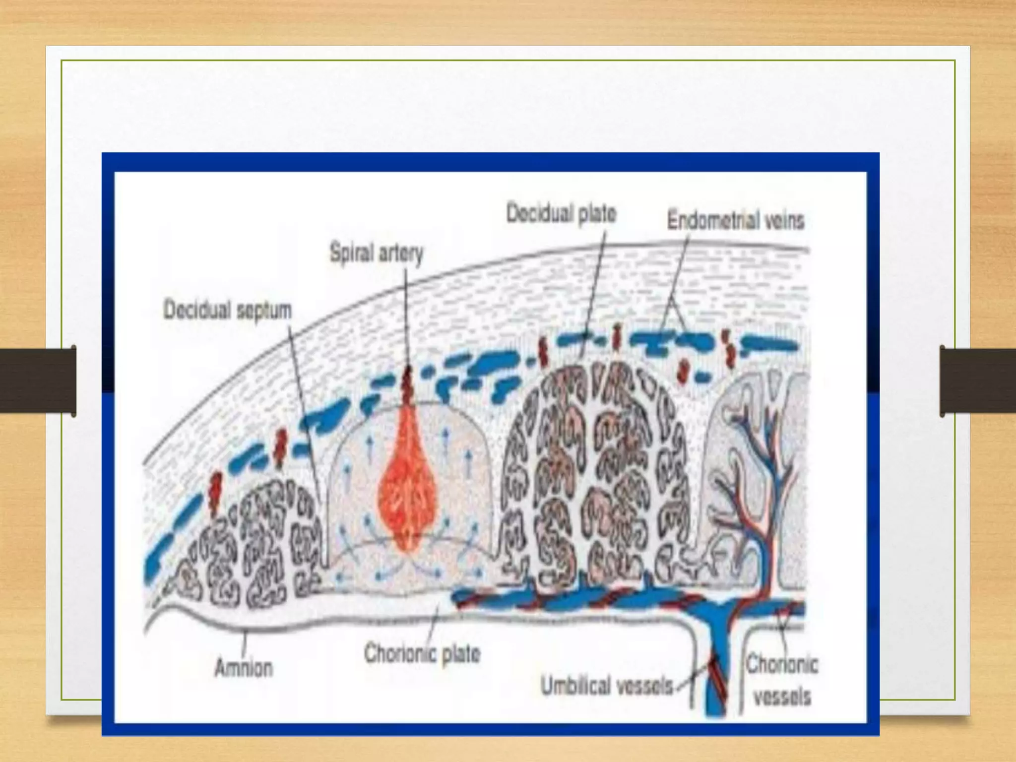 The placenta has fetal and maternal portions separated by chorionic and decidual plates. Between the plates are intervillous spaces containing maternal blood. During months 4-5, decidual septa divide the placenta into compartments called cotyledons. The placenta exchanges gases, nutrients, electrolytes and antibodies between mother and fetus. It also produces hormones like progesterone and estrogen to maintain pregnancy.
