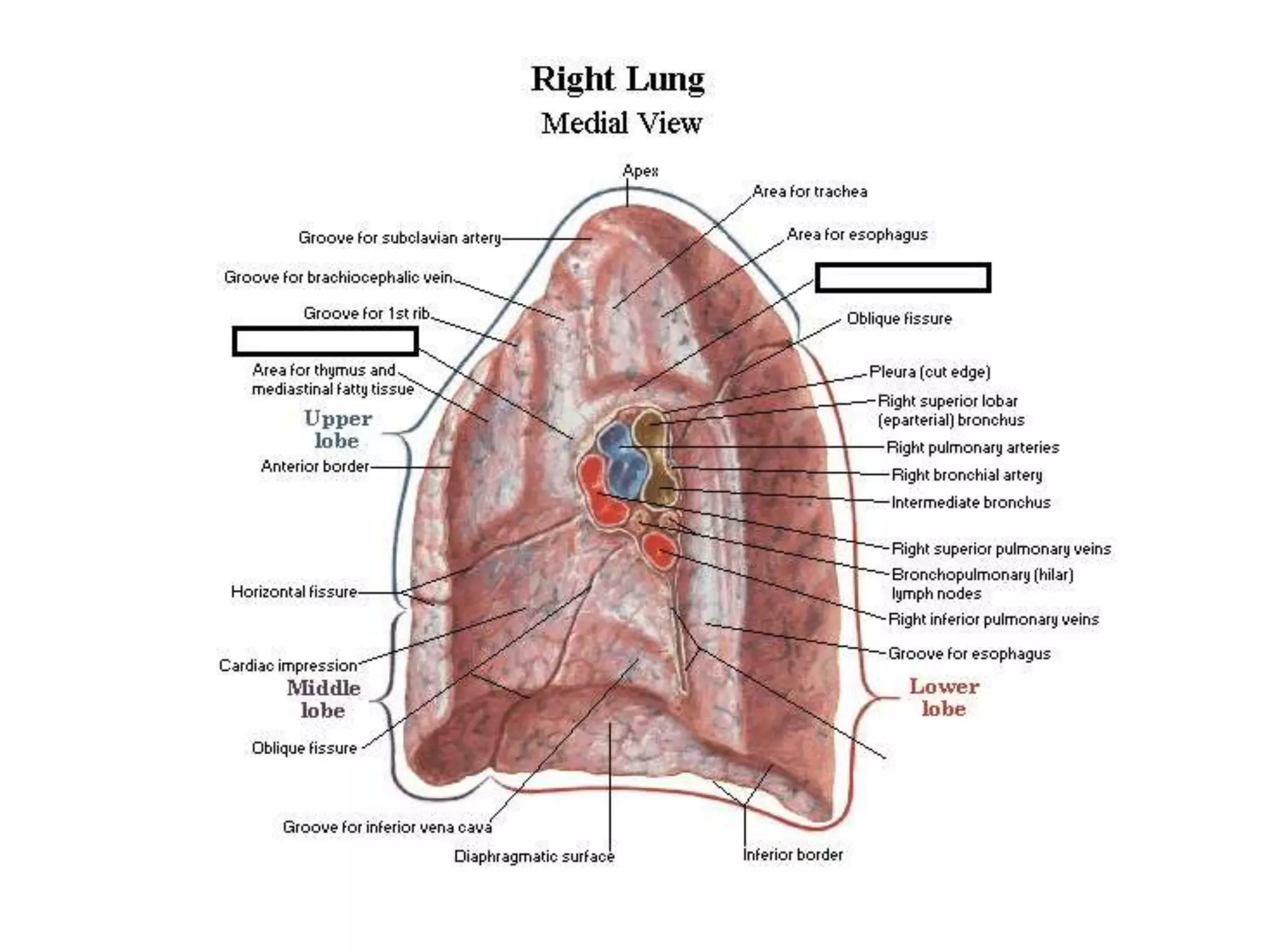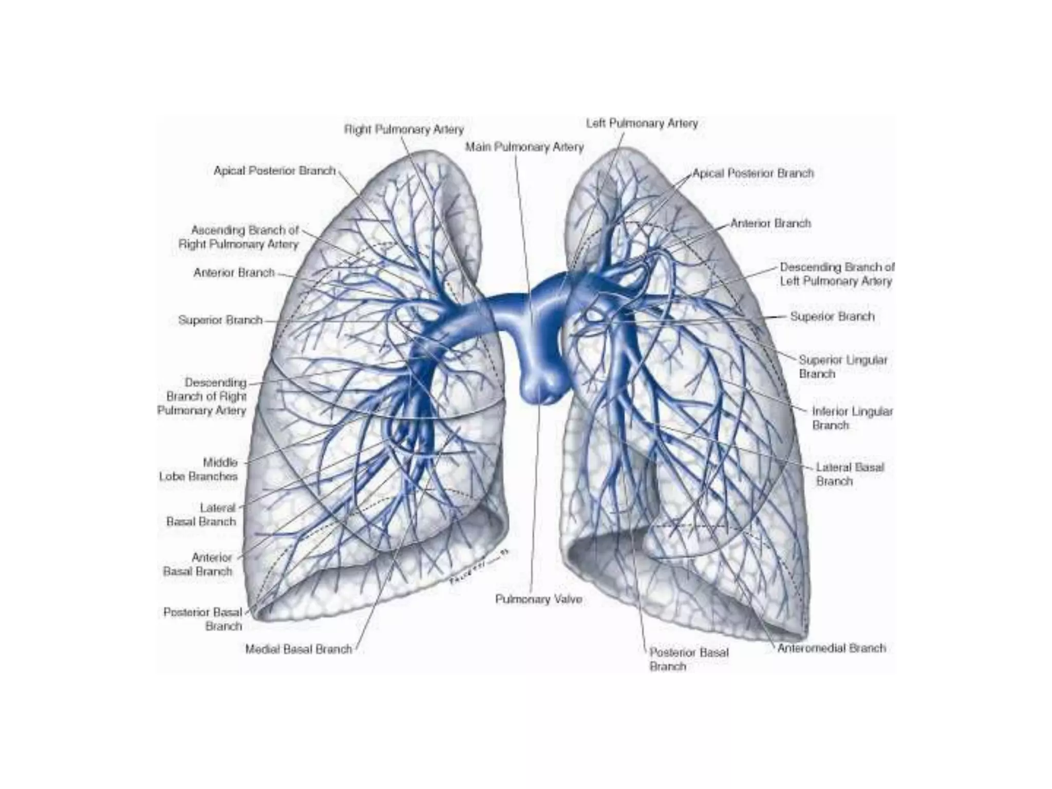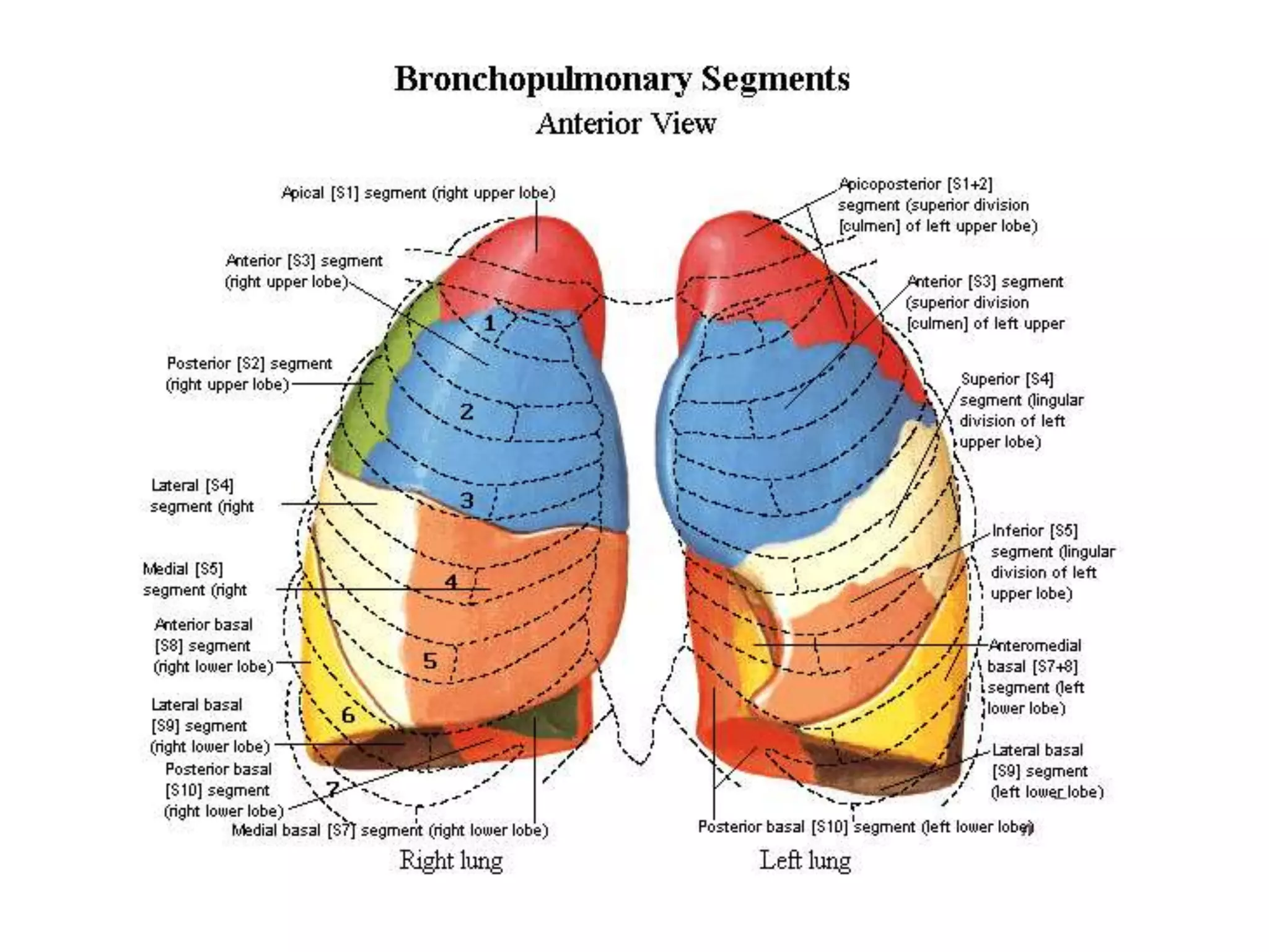 1. The document describes the structure and function of the lungs and trachea. It discusses key anatomical features like the trachea, bronchi, bronchopulmonary segments, blood supply, lymphatic drainage, and gas exchange in the lungs.