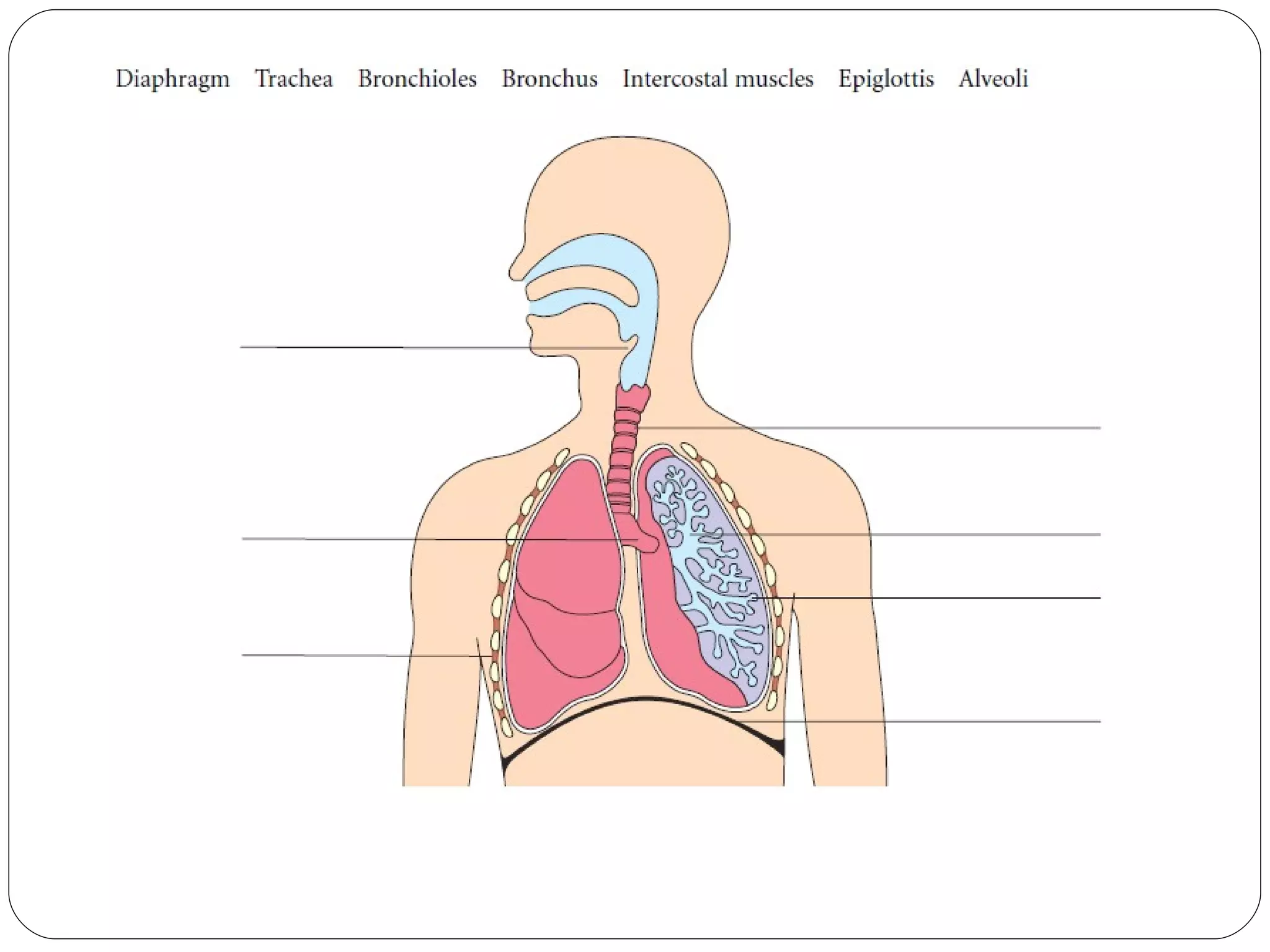 The document describes the structure and function of the respiratory system. It outlines the key components including the trachea, bronchi, bronchioles, alveoli, diaphragm, and intercostal muscles. It explains that inspiration occurs when the diaphragm and intercostal muscles contract, expanding the lungs to allow air entry. Expiration is the reverse process as these muscles relax and the lungs recoil, pushing air out. Gases are exchanged between the alveoli and blood via diffusion down a concentration gradient.