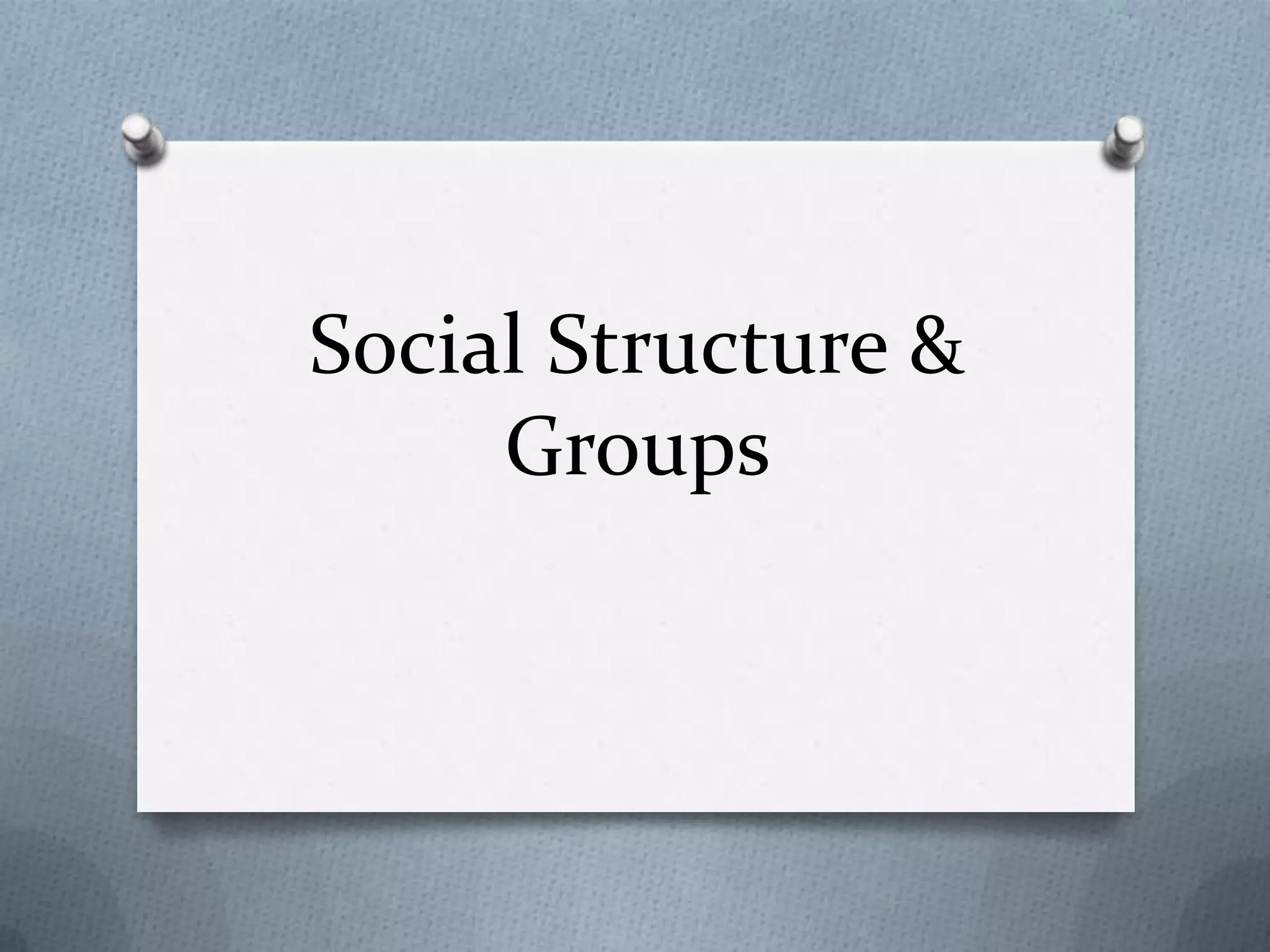 1) Social structure organizes society in predictable ways through statuses like ascribed and achieved, roles and expectations, and groups.
