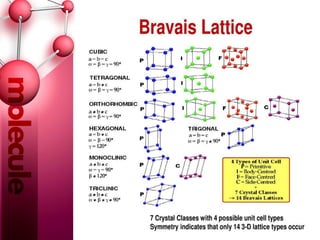 This document provides an overview of crystal structures and bonding in materials. It discusses topics such as the differences between crystalline and amorphous solids, unit cells, lattice structures, metallic crystal structures like body centered cubic and face centered cubic, atomic packing factors, and anisotropic vs isotropic materials. The key concepts covered include how crystal structures are composed of a periodic arrangement of points in a lattice, with atoms attached at each lattice point, and how properties can differ based on crystal structure and orientation.