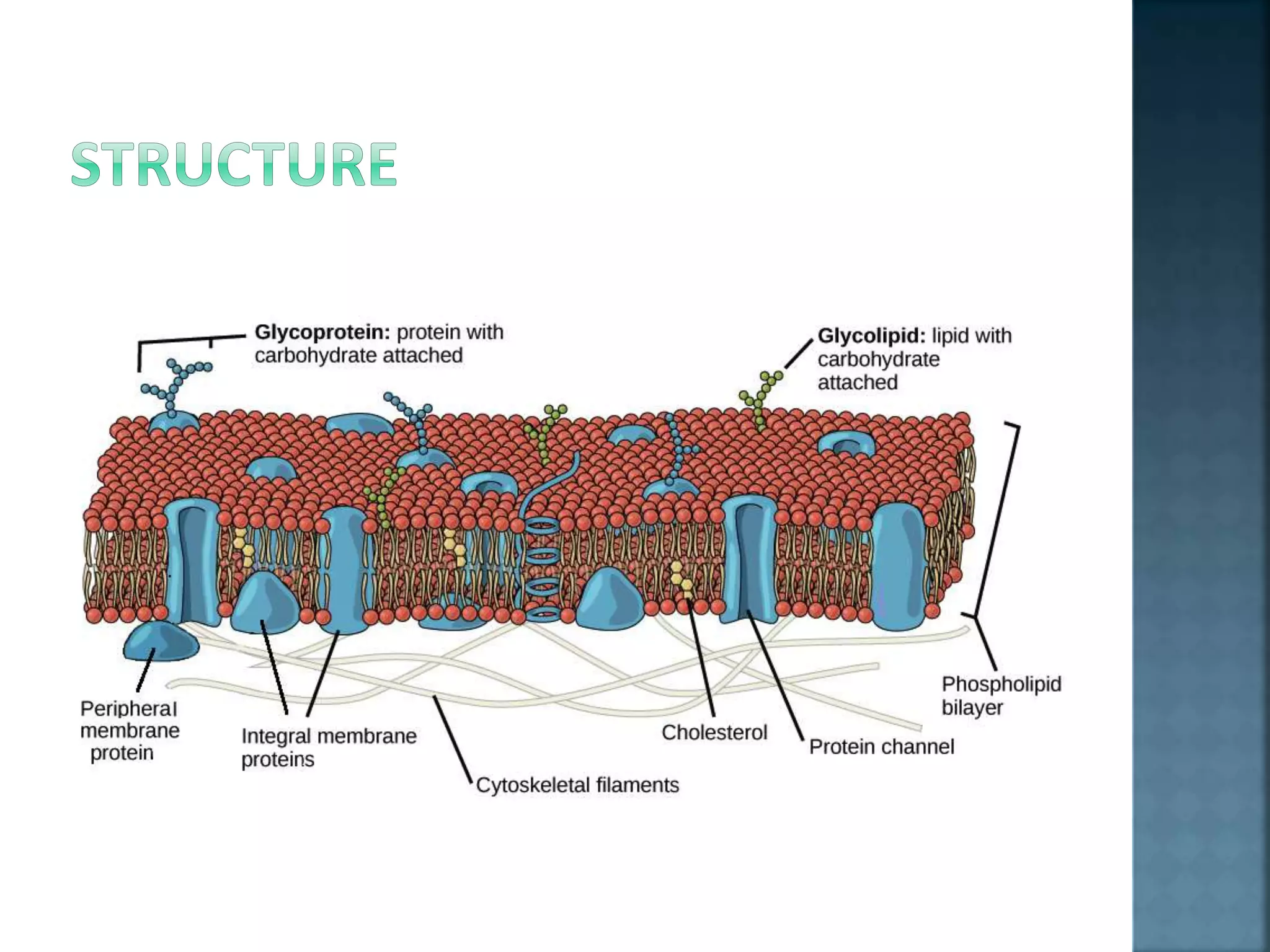 The fluid mosaic model proposes that the plasma membrane is made of a lipid bilayer with proteins embedded within it. The lipid bilayer is made up of phospholipids with hydrophilic heads facing out and hydrophobic tails facing inward. Cholesterol is also embedded within the bilayer. Integral proteins span or are embedded within the membrane, while peripheral proteins are attached to the membrane surface. Carbohydrates are attached to proteins and lipids on the outer surface of the membrane. Together, the lipids and proteins give the membrane a fluid structure that allows it to perform various functions for the cell.