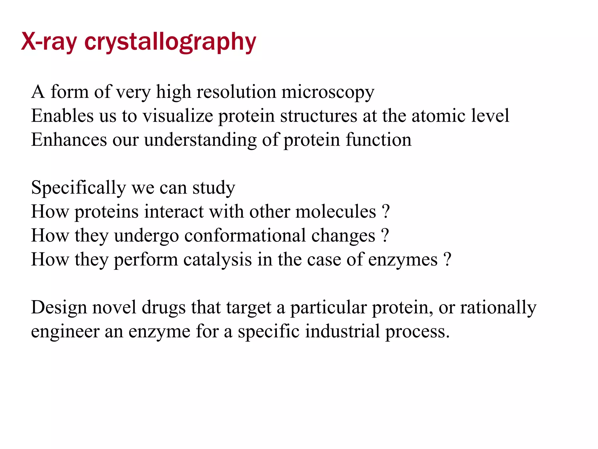 X-ray crystallography allows us to determine protein structures at the atomic level by visualizing the electron density map generated from X-ray diffraction data of protein crystals. Several steps are involved including growing high quality protein crystals, mounting crystals in the X-ray beam to collect diffraction data, solving the phase problem to produce an electron density map, building and refining an atomic model that fits the map, and validating the final protein structure. This technique provides insights into protein function and enables structure-based drug design.