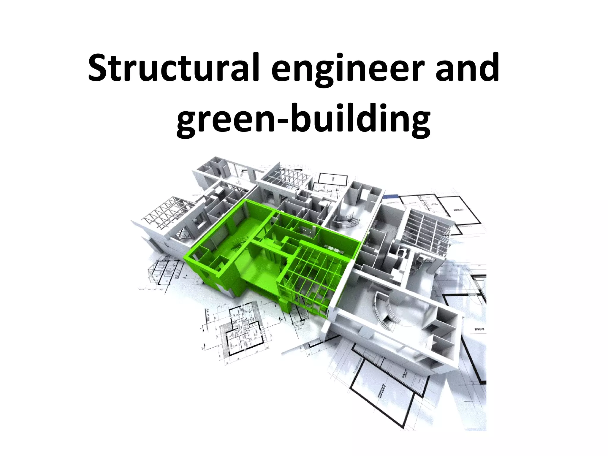 The document discusses how building structure materials can impact the sustainability of buildings. It analyzes concrete, steel, and wood structures and their effect on LEED credits related to site development, energy performance, material reuse and recycling, and indoor air quality. Precast concrete is highlighted as potentially supporting credits through features like off-site manufacturing, sandwich wall panels for insulation, embedding geothermal piping, and using hollow core slabs for ventilation. The conclusion emphasizes reducing and reusing materials, as well as integrated design solutions.