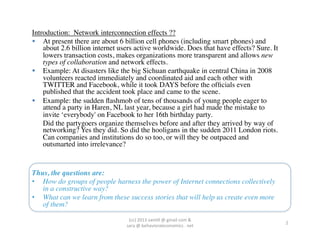 This document discusses the structure of "Weavelet Lenses" which can be used to construct collective intelligent organizations. It describes how living systems from cells to human brains are able to harness the power of interconnected networks. The visual system is provided as an example of how individual sensors can work together in the brain to provide depth perception and pattern recognition. The document proposes that organizations can function like a "telescope" by allowing unique contributions from open sensors across a network to synthesize a more detailed picture. It introduces the concept of a "Weavelet" as a new organizational paradigm that is distributed, transparent, peer-to-peer and able to scale up through open connectivity and distributed decision making like the cells in a living organism