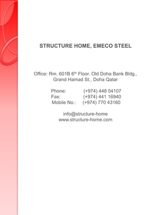 Structure Home EMECO Steel provides steel fabrication and installation services. It has 78 fabrication and 45 installation employees with various welding and cutting equipment. It manages design, fabrication, and installation of steel structures. It has worked on industrial, power station, cement, petrochemical, residential, and harbor projects in Qatar, Saudi Arabia, Sudan, Lebanon, and other countries. Key clients include Energya, United Engineers, Steel Tec, and Orascom.
