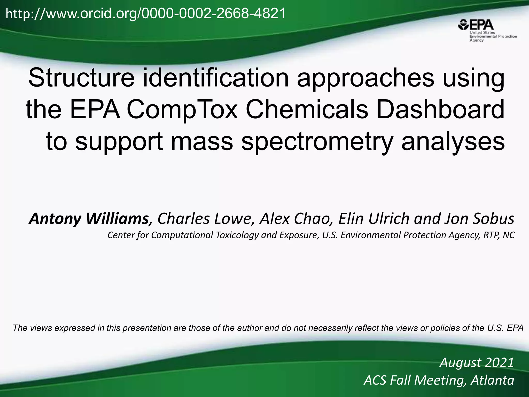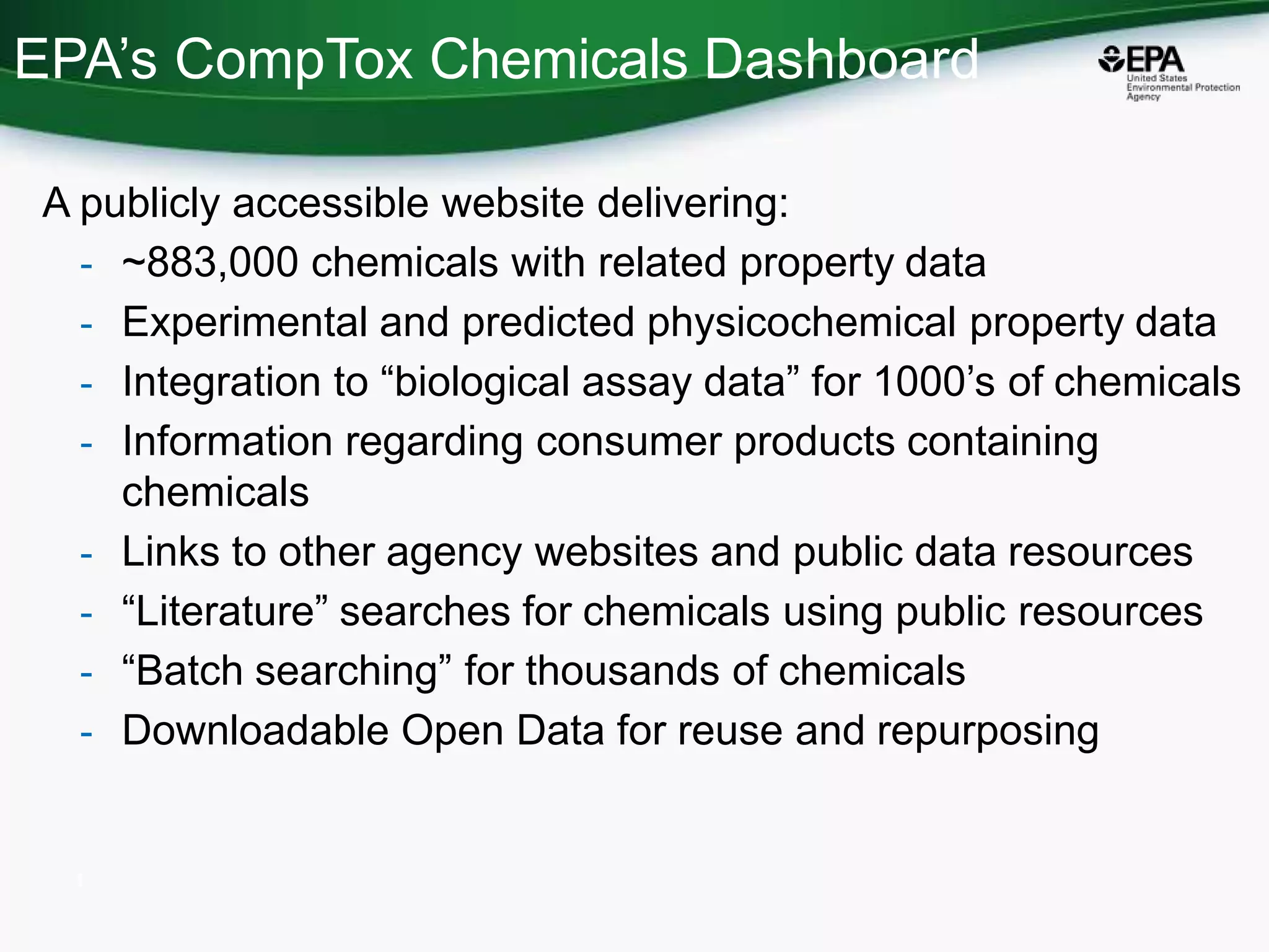The document discusses how the EPA's CompTox Chemicals Dashboard can be used to support mass spectrometry analyses for structure identification. The Dashboard contains data on over 800,000 chemicals including properties, lists, and links to other resources. It allows searching by formula, structure, and mass to find related chemicals. Candidate structures can be ranked using metadata. Predicted mass spectra from over 800,000 structures may also be accessible. The Dashboard integrates data to help identify unknown chemicals detected by mass spectrometry.