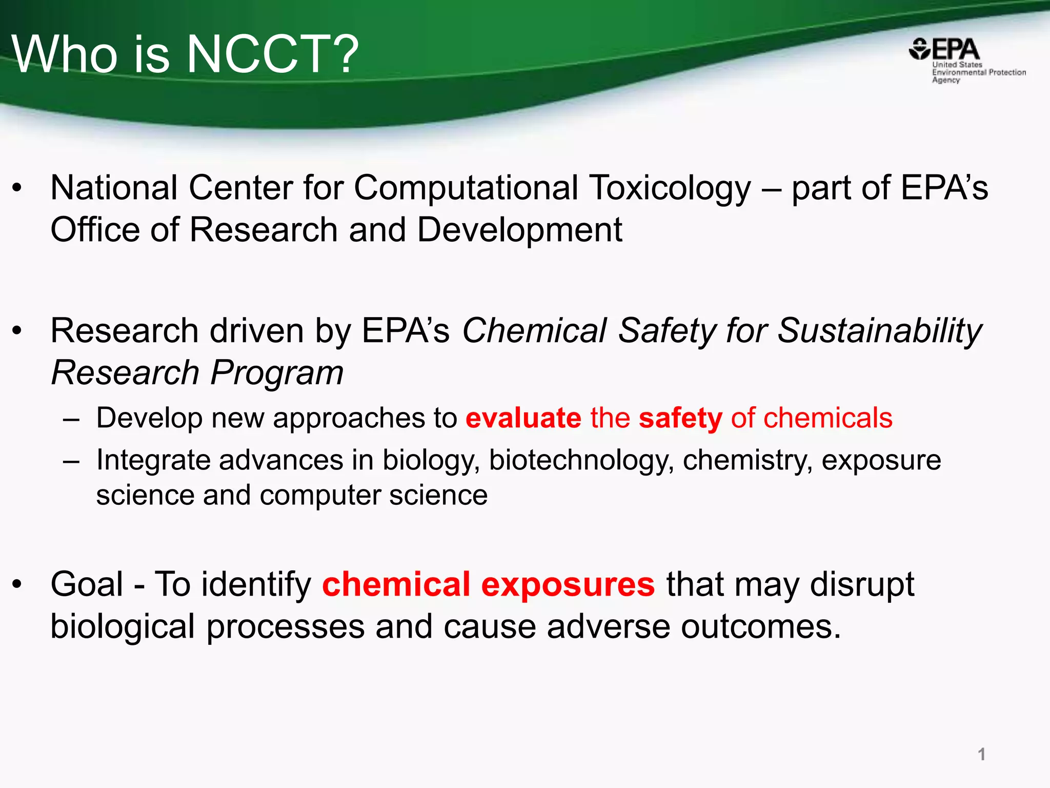 The document discusses the development of a dashboard by the EPA's National Center for Computational Toxicology to identify chemical exposures that may disrupt biological processes. This dashboard contains over 720,000 chemical records and supports non-targeted analysis by providing detailed chemical data, curation, and searching capabilities. The presentation emphasizes the importance of data quality and future research directions for improving chemical identification and analysis.