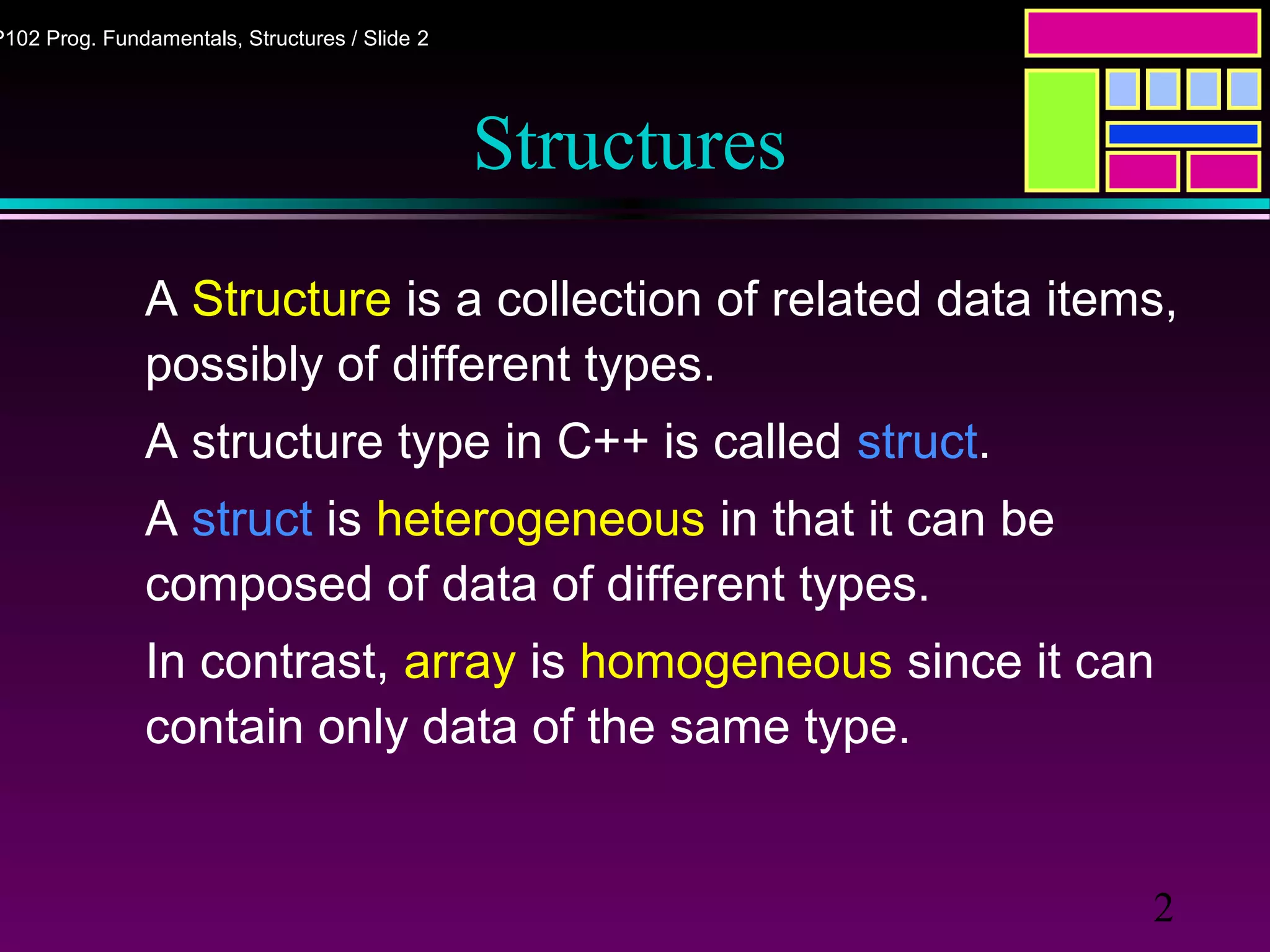This document discusses structures in C++. It defines a structure as a collection of related data items that can be of different types. Structures allow grouping of data together, like elements in a student record. Individual structure members can be accessed using the dot operator. Arrays of structures and structures containing arrays are also discussed. Examples are provided to demonstrate defining, declaring, initializing, and assigning values to structures and nested structures.