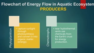 The document describes the structure and energy flow of aquatic ecosystems. It outlines the key abiotic components, biotic components including producers, consumers and decomposers, and interactions such as food webs, habitat use, and nutrient cycling. Specifically, it provides flowcharts and explanations of the components and flow of energy in both freshwater and marine ecosystems.