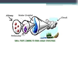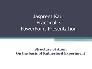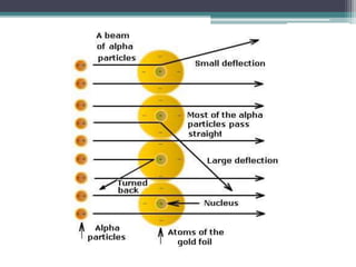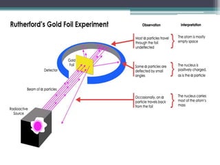 The document discusses the structure of the atom based on Rutherford's experiment, highlighting that atoms are tiny, indivisible particles. Rutherford's experiment with gold foil revealed that most of the atom is empty space, with a dense nucleus containing positive charge and mass. It contrasts this with Thomson's plum pudding model, emphasizing the significant shifts in understanding atomic structure brought about by Rutherford's findings.