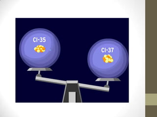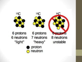 This chapter discusses the structure of the atom, including analyzing matter, synthesizing atomic structure, understanding isotopes and their uses, and appreciating the orderliness and uniqueness of atomic structure. Isotopes of the same element have the same number of protons but different numbers of neutrons. While isotopes have the same chemical properties due to their identical number of electrons, they have different physical properties because of varying neutron counts. The electronic structure of an atom is organized into shells, with the first shell holding up to 2 electrons and higher shells able to accommodate more electrons in set numbers.