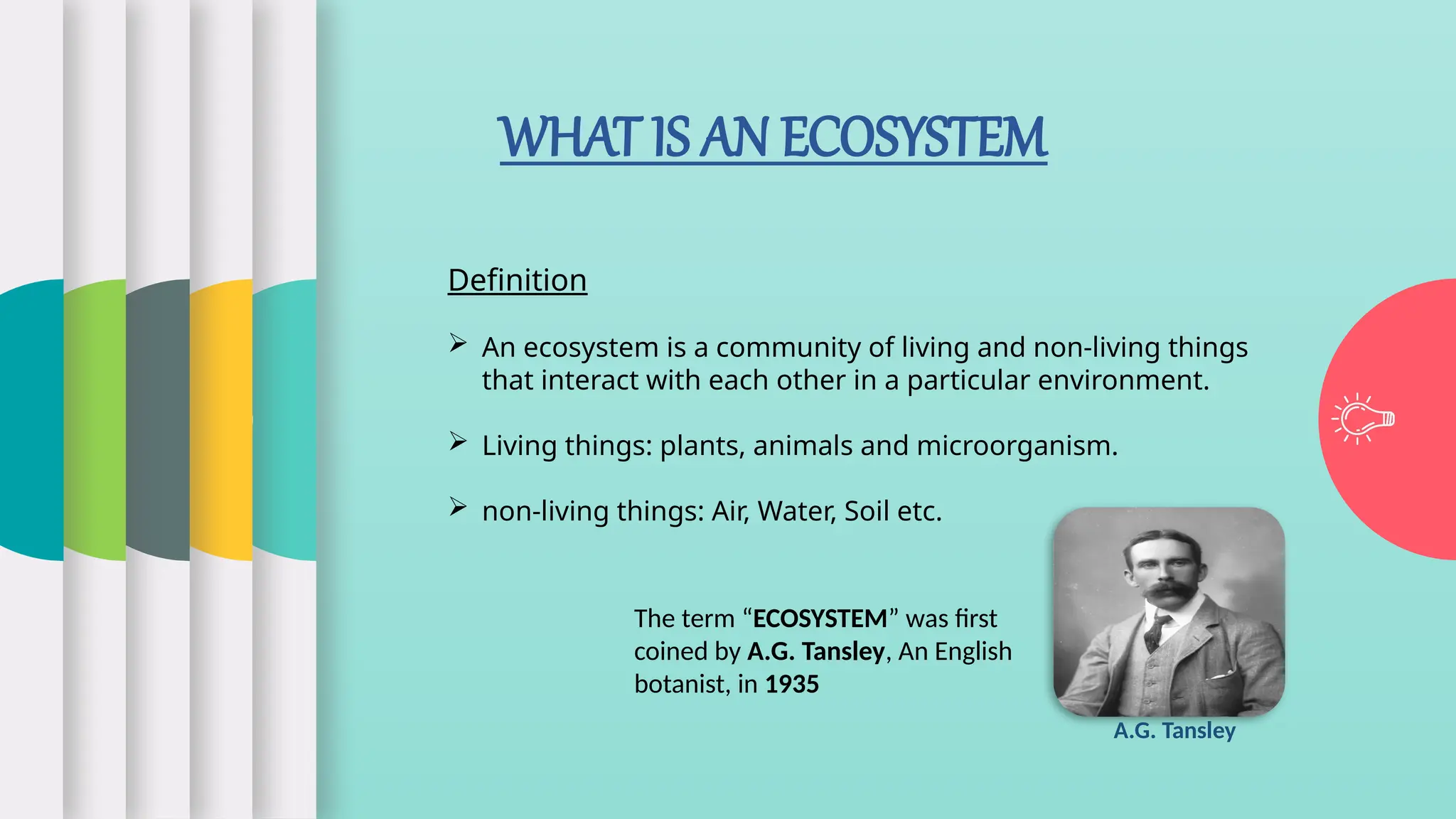 The document presents an overview of ecosystems, defining them as communities of living (biotic) and non-living (abiotic) components that interact within an environment. It categorizes biotic components into producers, consumers (herbivores, carnivores, omnivores), detritivores, and decomposers, while abiotic components include physical and chemical factors like climate and nutrients. The presentation credits A.G. Tansley for coining the term 'ecosystem' in 1935.