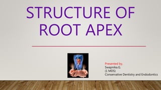 The document discusses the anatomy and histology of the root apex. It describes the development of root structures including the apical constriction, cementodentinal junction, and apical foramen. Variations in root apex morphology are discussed including accessory canals, resorption, and calcifications. The clinical significance of understanding root apex anatomy for procedures like working length determination, apical resection, and apexification are summarized.