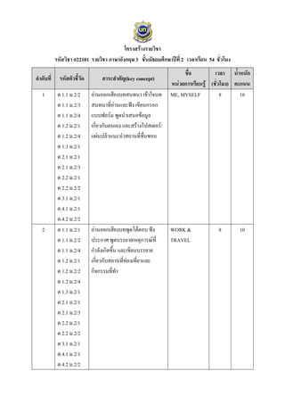 รหัสวิชา อ22101 รายวิชา ภาษาอังกฤษ 3 ชันมัธยมศึกษาปีที่ 2 เวลาเรียน 54 ชั่วโมง ้ ชือ ่ เวลา น้าหนัก ลาดับที่ รหัสตัวชี้วัด สาระสาคัญ(key concept) หน่วยการเรียนรู้ (ชั่วโมง) คะแนน 1 ต 1.1 ม.2/2 อ่านออกเสียงบทสนทนา เข้าใจบท ME, MYSELF 8 10 ต 1.1 ม.2/3 สนทนาที่อ่านและฟัง เขียนกรอก ต 1.1 ม.2/4 แบบฟอร์ม พูดนาเสนอข้อมูล ต 1.2 ม.2/1 เกี่ยวกับตนเอง และสร้างโปสเตอร์/ ต 1.2 ม.2/4 แผ่นปลิวแนะนาสถานที่ชื่นชอบ ต 1.3 ม.2/1 ต 2.1 ม.2/1 ต 2.1 ม.2/3 ต 2.2 ม.2/1 ต 2.2 ม.2/2 ต 3.1 ม.2/1 ต 4.1 ม.2/1 ต 4.2 ม.2/2 2 ต 1.1 ม.2/1 อ่านออกเสียงบทพูดโต้ตอบ ฟัง WORK & 8 10 ต 1.1 ม.2/2 ประกาศ พูดบรรยายเหตุการณ์ที่ TRAVEL ต 1.1 ม.2/4 กาลังเกิดขึ้น และเขียนบรรยาย ต 1.2 ม.2/1 เกี่ยวกับสถานที่ท่องเที่ยวและ ต 1.2 ม.2/2 กิจกรรมที่ทา ต 1.2 ม.2/4 ต 1.3 ม.2/1 ต 2.1 ม.2/1 ต 2.1 ม.2/3 ต 2.2 ม.2/1 ต 2.2 ม.2/2 ต 3.1 ม.2/1 ต 4.1 ม.2/1 ต 4.2 ม.2/2