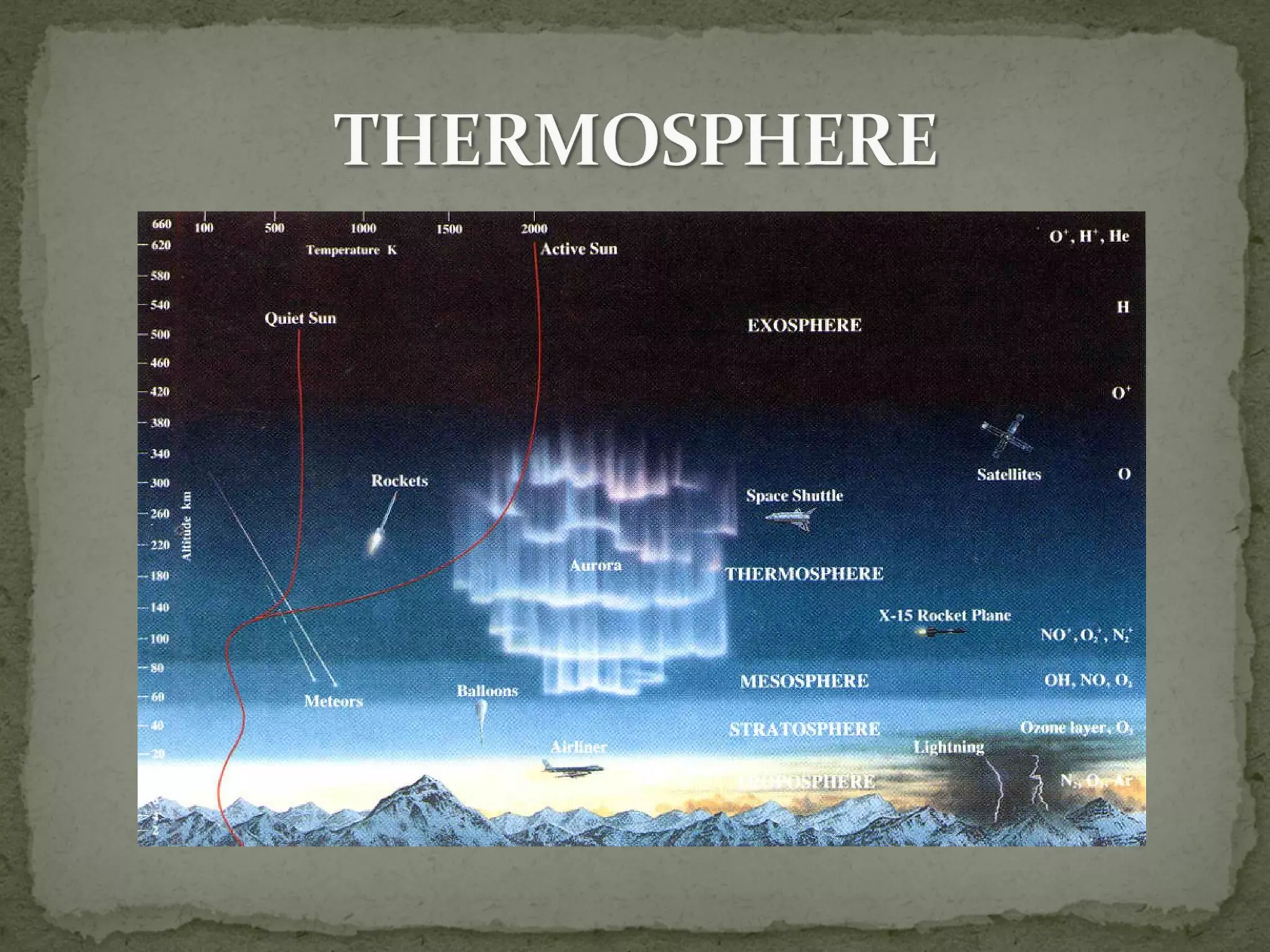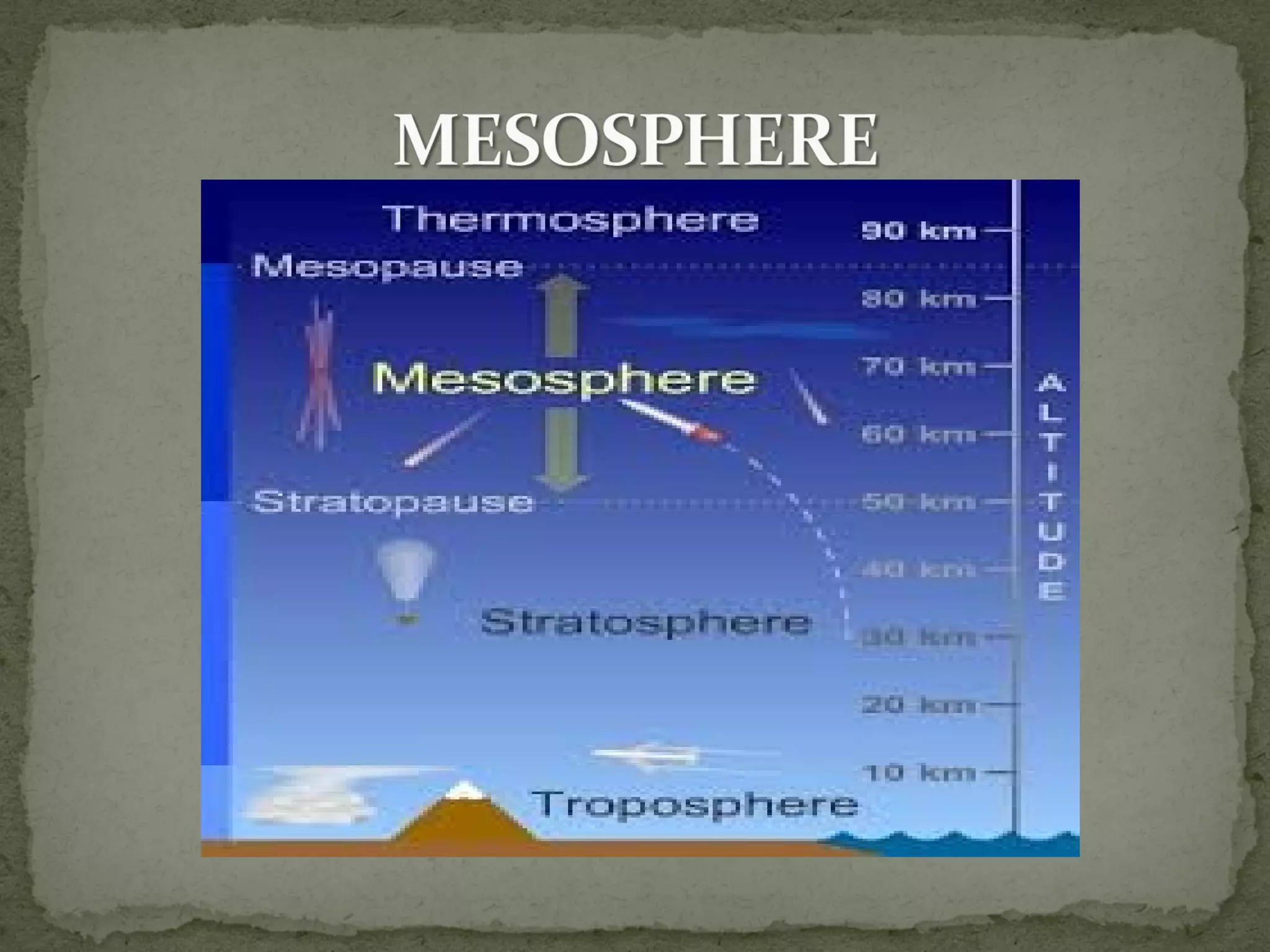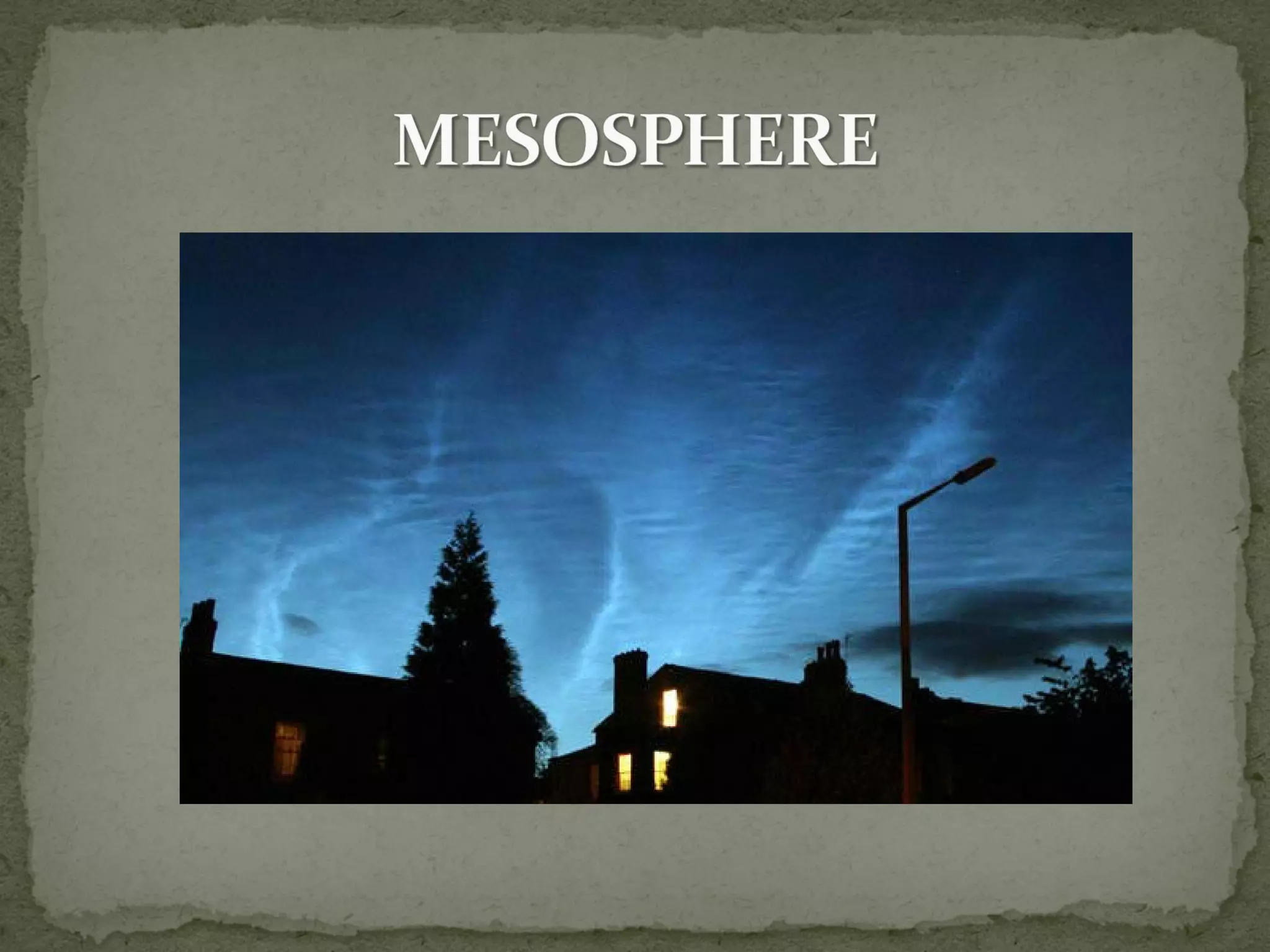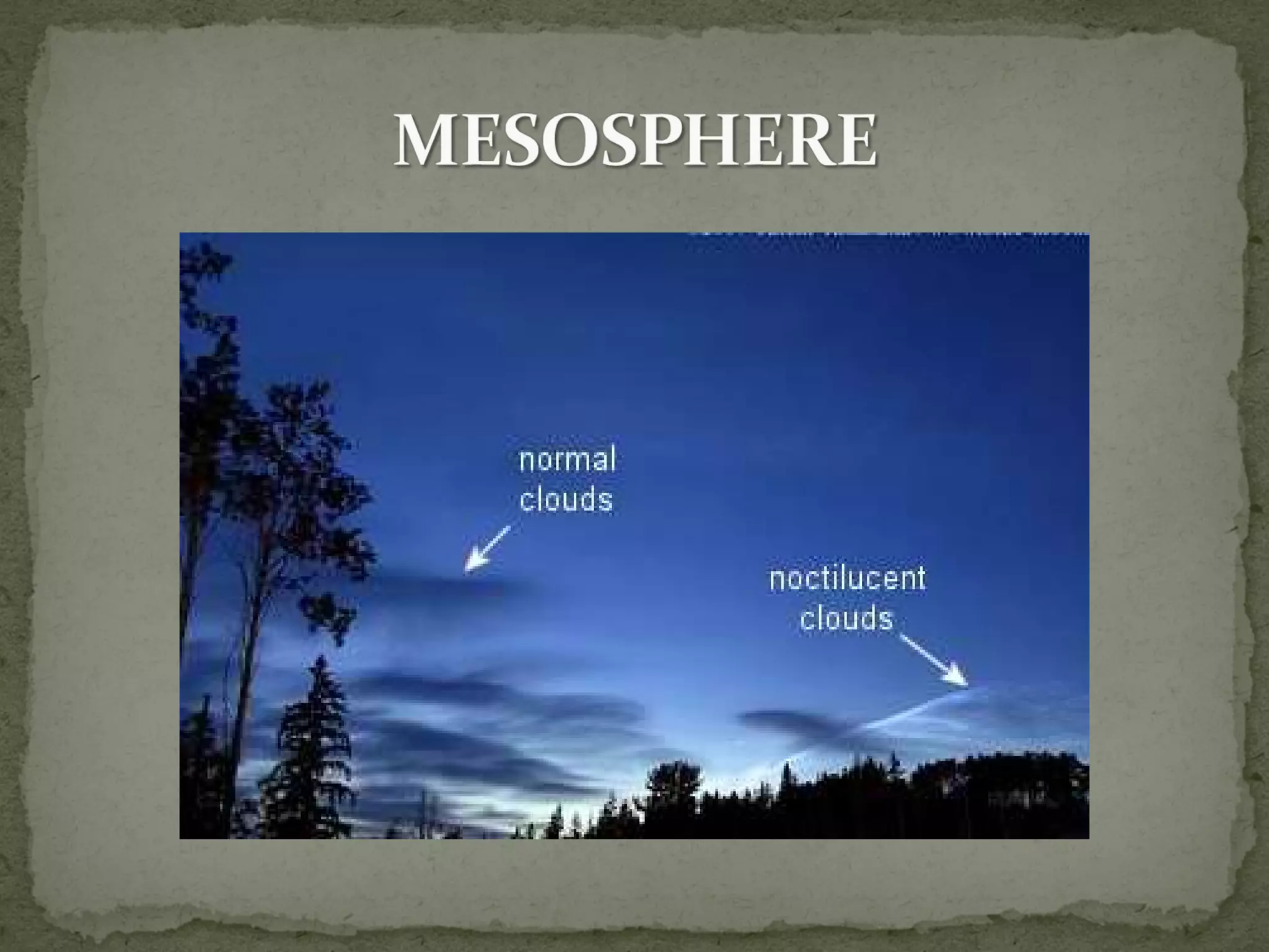 - The mesosphere is the coldest layer, reaching -95°C, located from 40-48 km to 80-96 km. It contains noctilucent clouds.