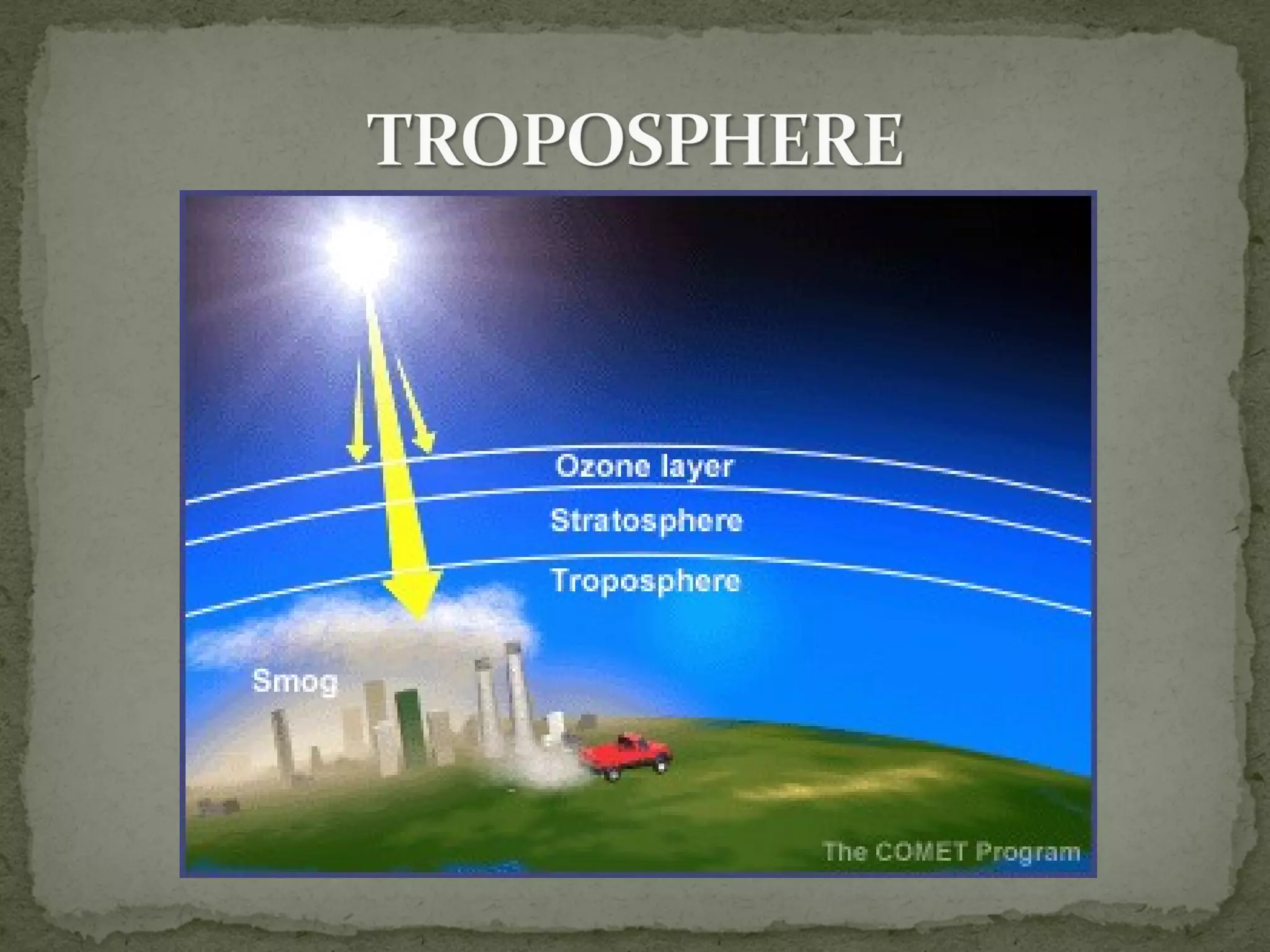 - The troposphere is the lowest layer where weather occurs and contains 75% of the atmosphere's mass. It extends from Earth's surface to around 12 km.