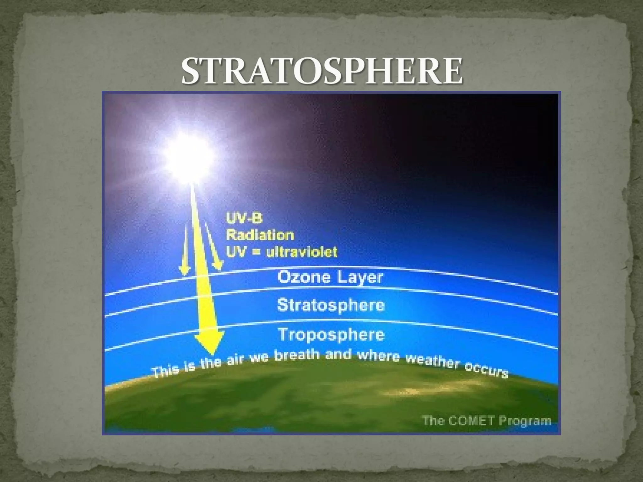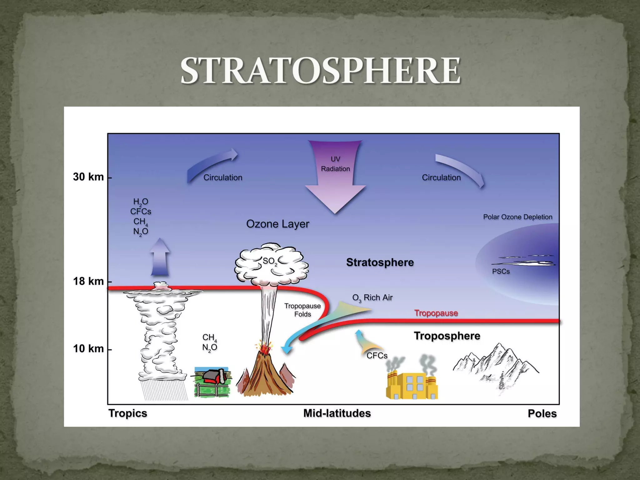 - The stratosphere is above the troposphere, extending from around 12 km to 40-48 km. Temperature remains constant or increases with height due to ozone absorption.