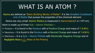 1) An atom is made up of protons, neutrons, and electrons. Protons and neutrons are located in the nucleus, while electrons orbit the nucleus.