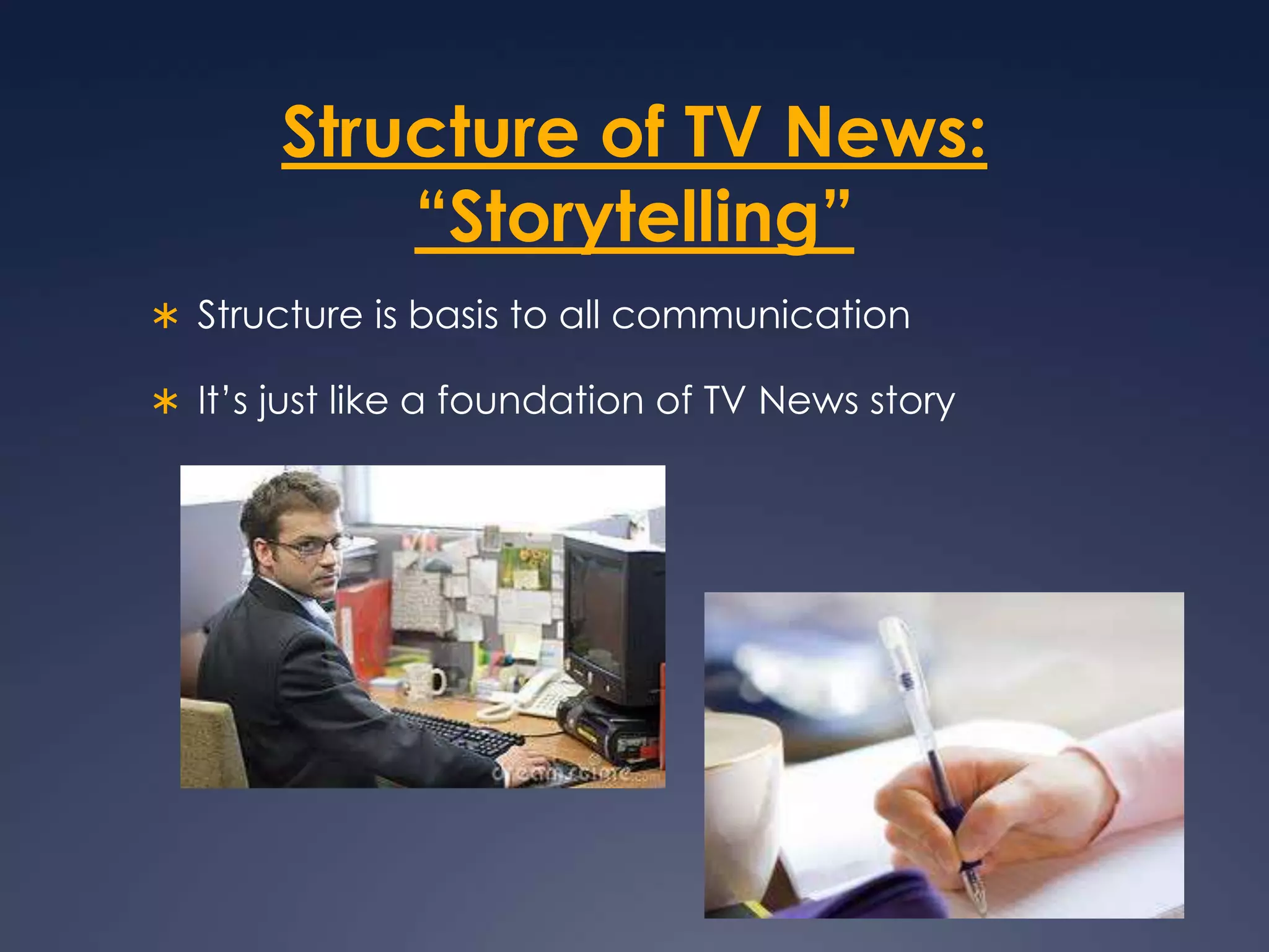 The document discusses the storytelling structure of television news, emphasizing its importance in effective communication. It explores how news is produced, the role of visuals and words, the significance of anchorpersons, and the need for linear presentation to keep viewers engaged. Additionally, it highlights the necessity of visual continuity and clarity to ensure audiences are informed and connected with the story being told.