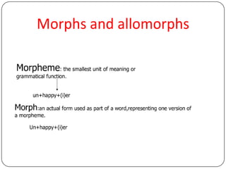 This document discusses the structure of words in morphology. It defines words, morphemes, and different types of morphemes. There are free and bound morphemes. Lexical morphemes convey meaning while grammatical morphemes provide grammatical information. Derivational affixes create new words while inflectional affixes create word forms. Allomorphs are variant forms of morphemes. The structure of words can be analyzed down to the morpheme level. There is no definite longest word in English because new complex words can always be created by combining morphemes.