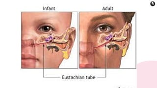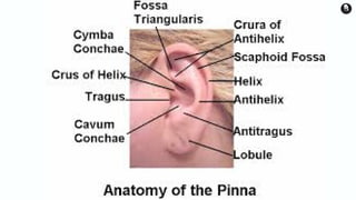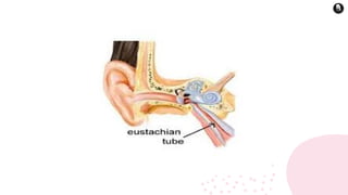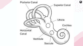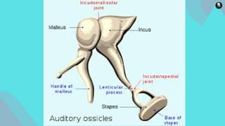The document provides a detailed overview of the human ear, highlighting its anatomy and functions, which include sound transmission and balance maintenance. It divides the ear into three parts: the outer ear, middle ear, and inner ear, summarizing the roles of each component, such as the pinna, tympanic membrane, and semicircular canals. Additionally, it describes the Eustachian tube's function in pressure regulation and the importance of the vestibular complex in maintaining equilibrium.