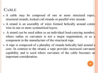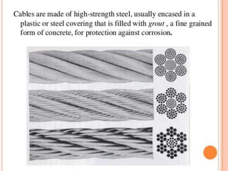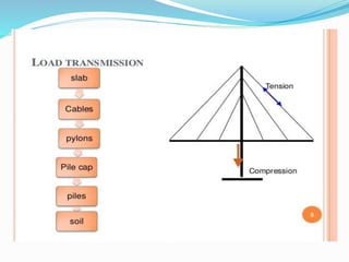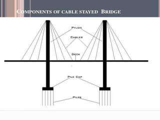 - The key structural elements of cable stayed bridges - the deck, piers, towers, and stays that connect and transfer loads.