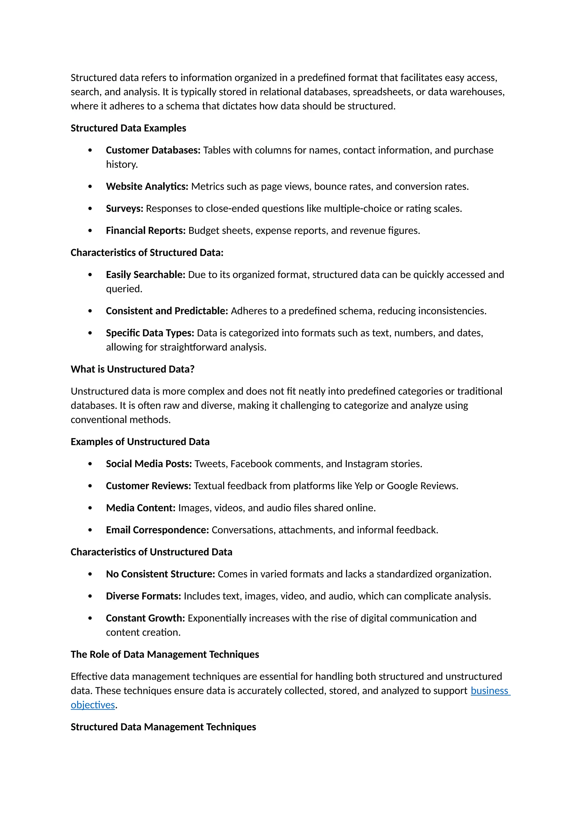 The document discusses the importance of balancing structured and unstructured data for business success, noting that structured data comprises about 20% and unstructured data 80% of total data generated. It highlights the benefits of both data types in enhancing decision-making and online reputation management, while outlining effective management techniques for each. By integrating structured and unstructured data, businesses can improve customer engagement and drive long-term success.